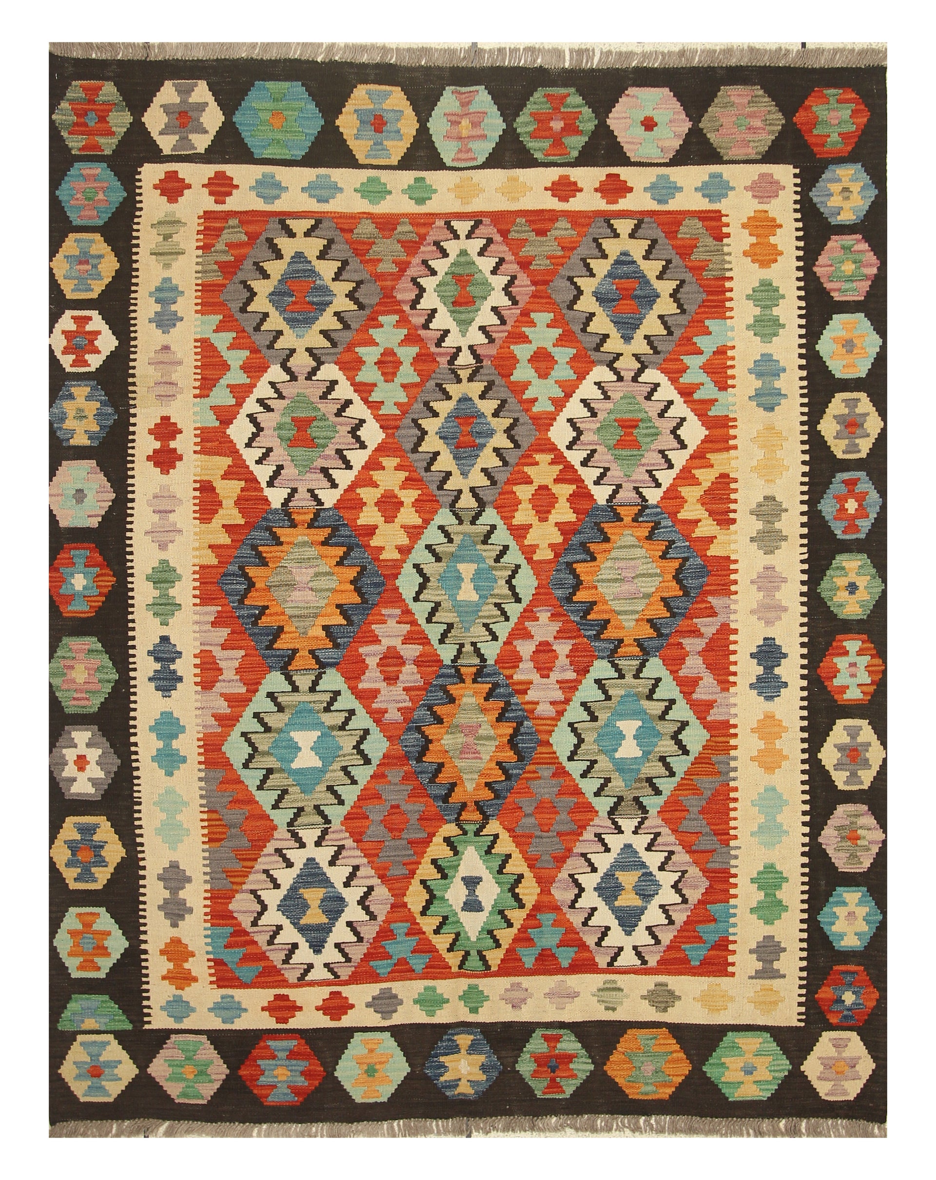 5x7 Orange Black Afghan Geometric Reversible Kilim Rug