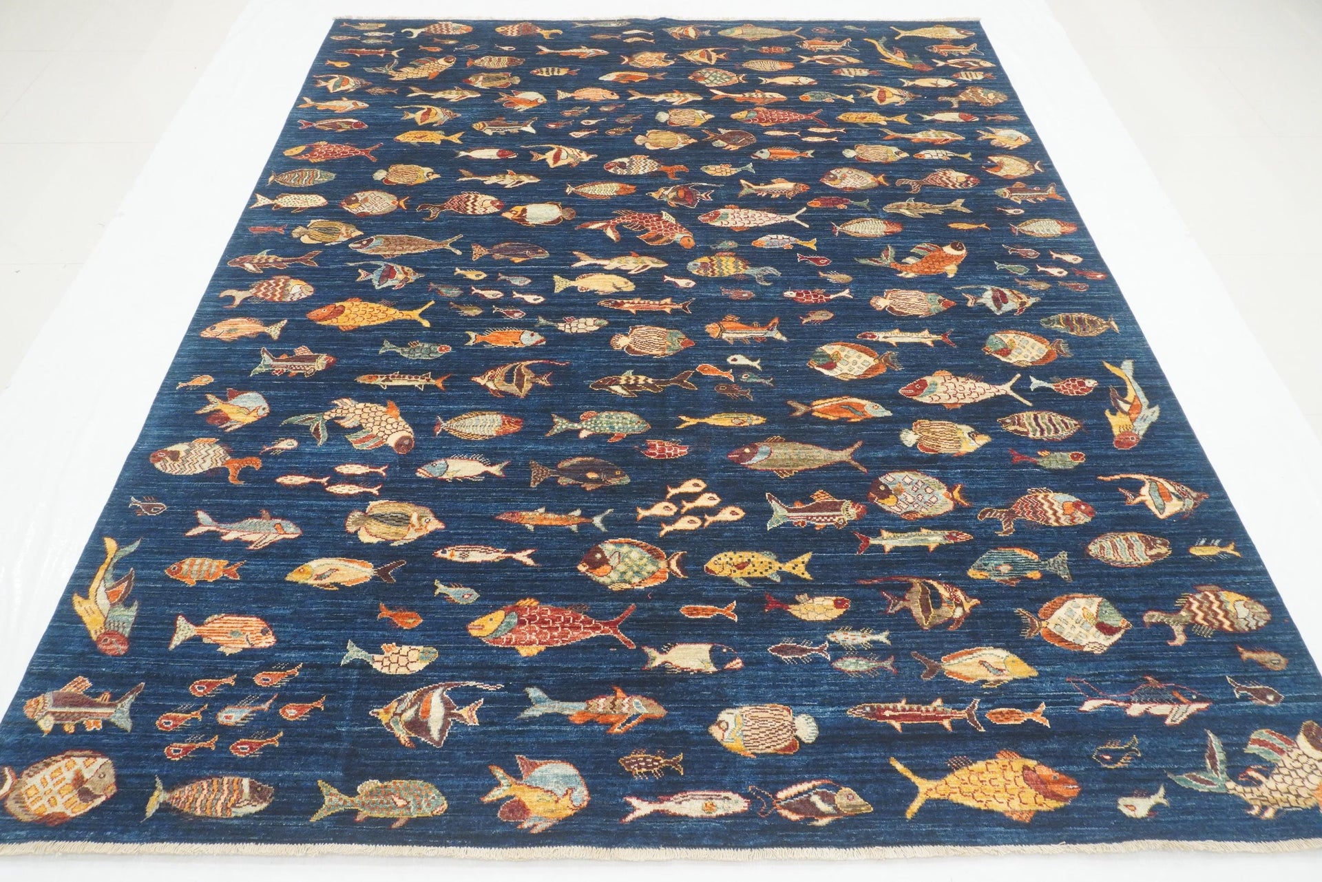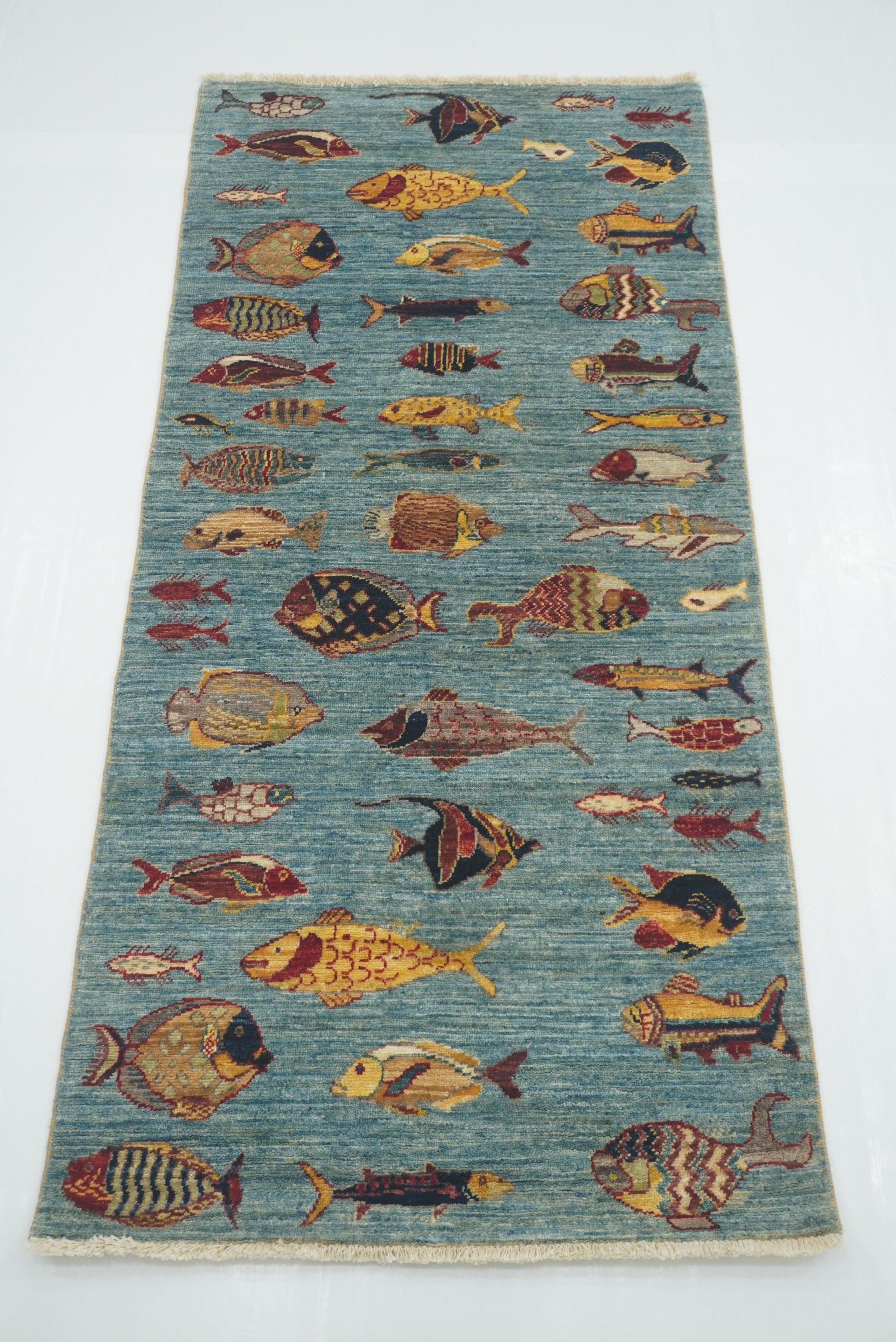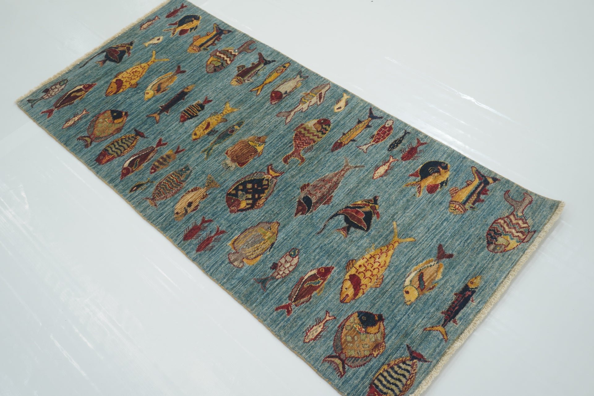 3'11"x11'6" Blue Fish Gabbeh Hand Knotted Afghan Runner Rug