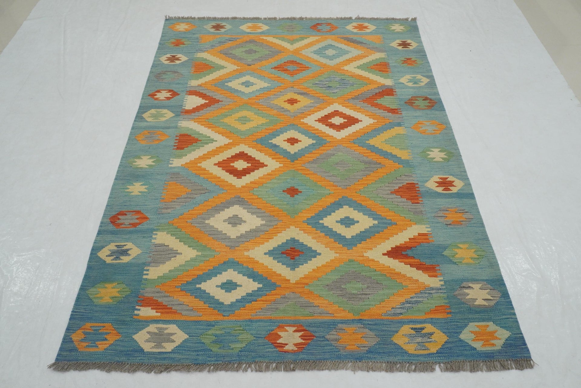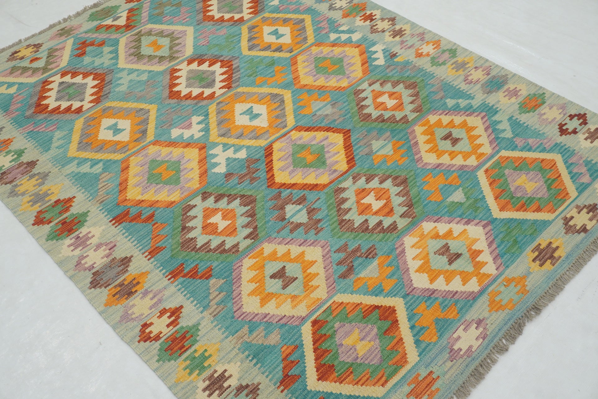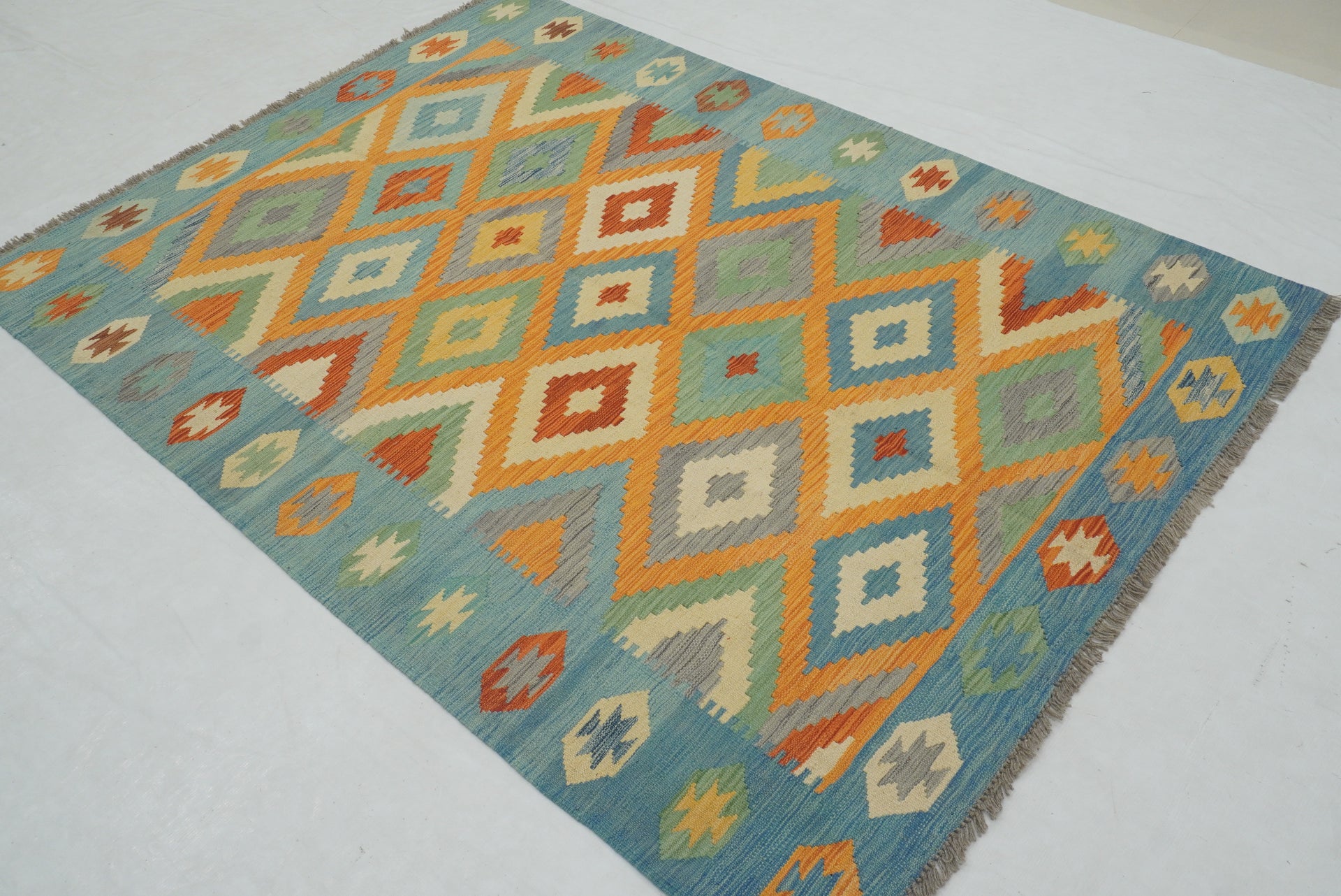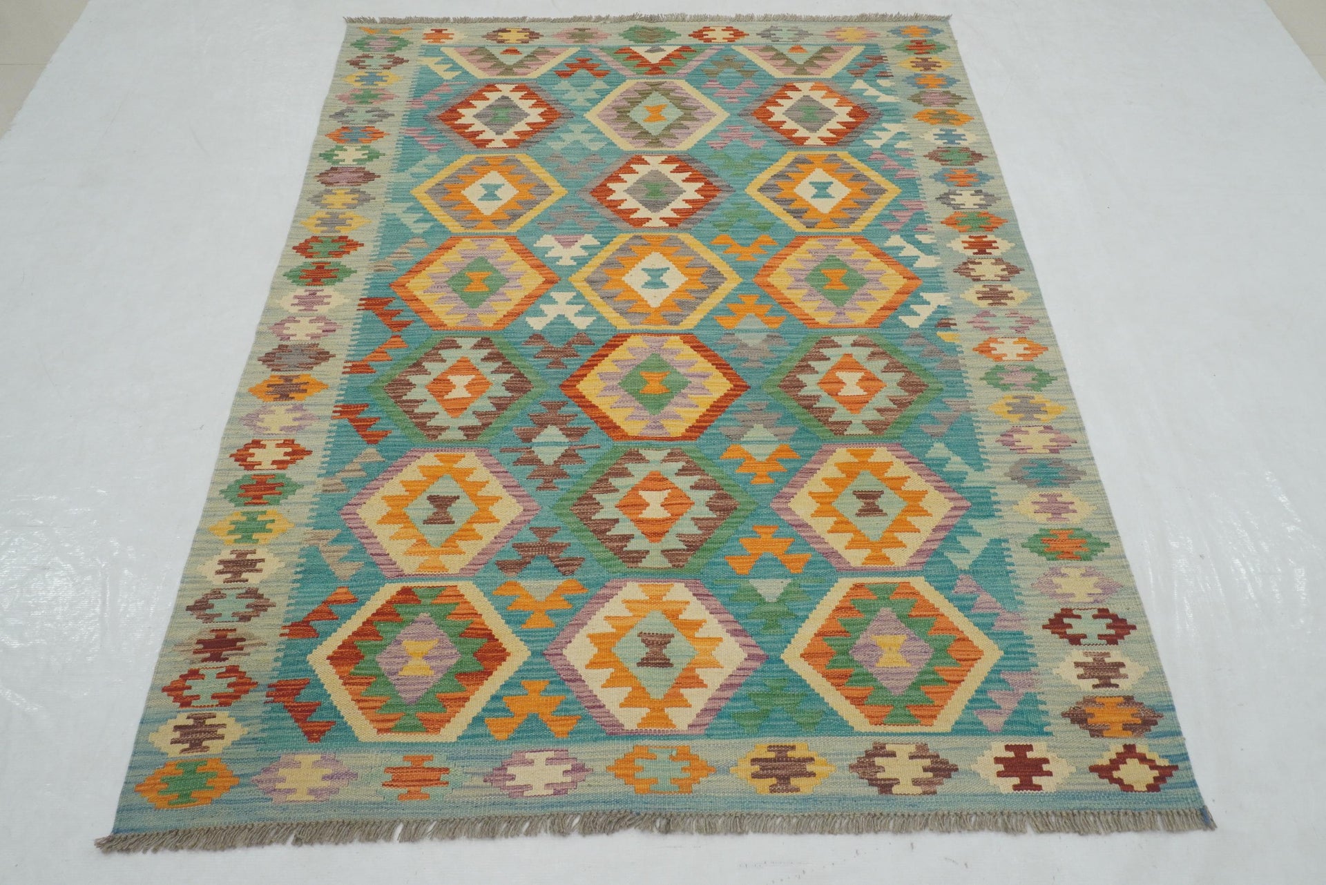 6x8 Turquoise Blue Afghan Hand-Knotted Wool Floral Rug