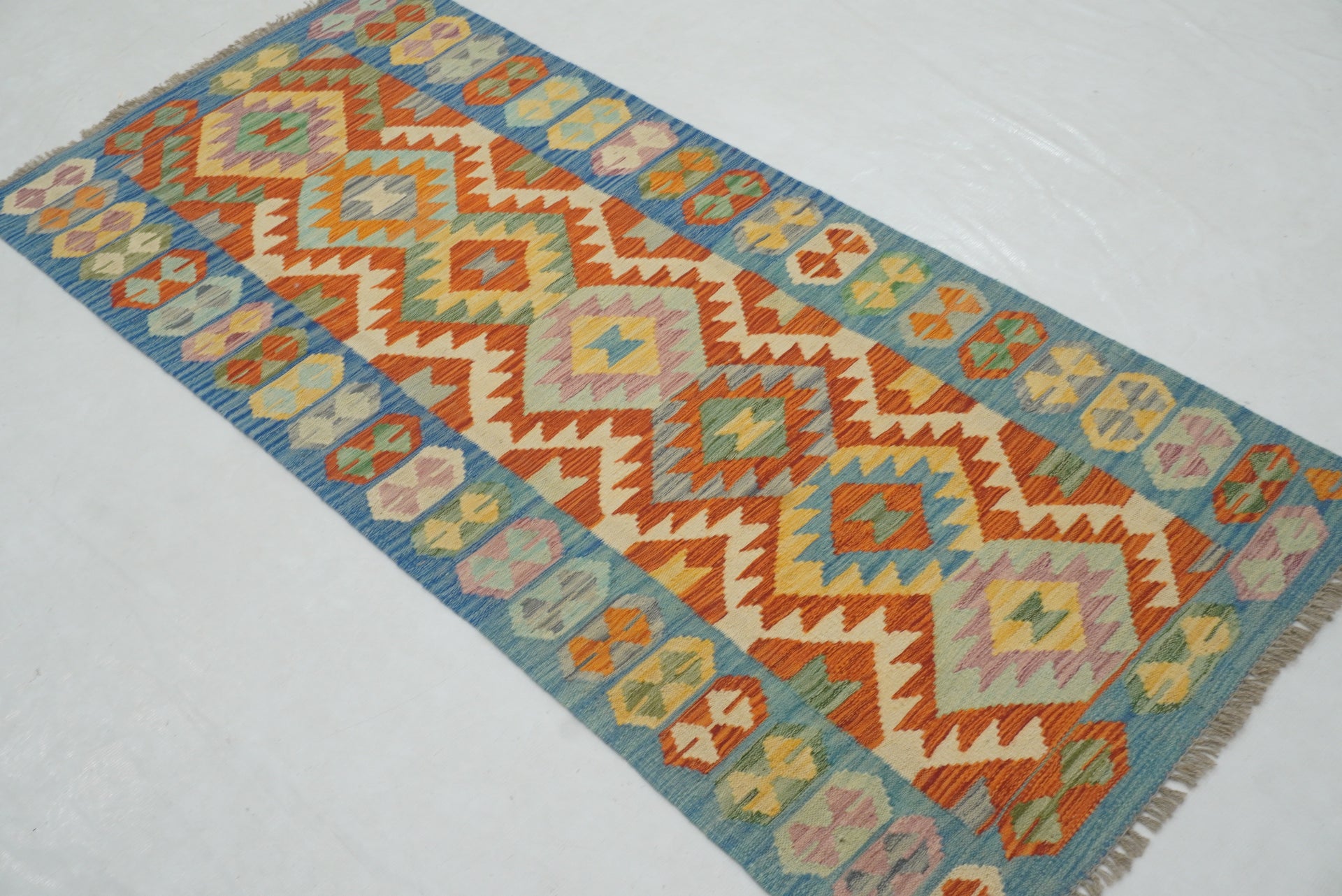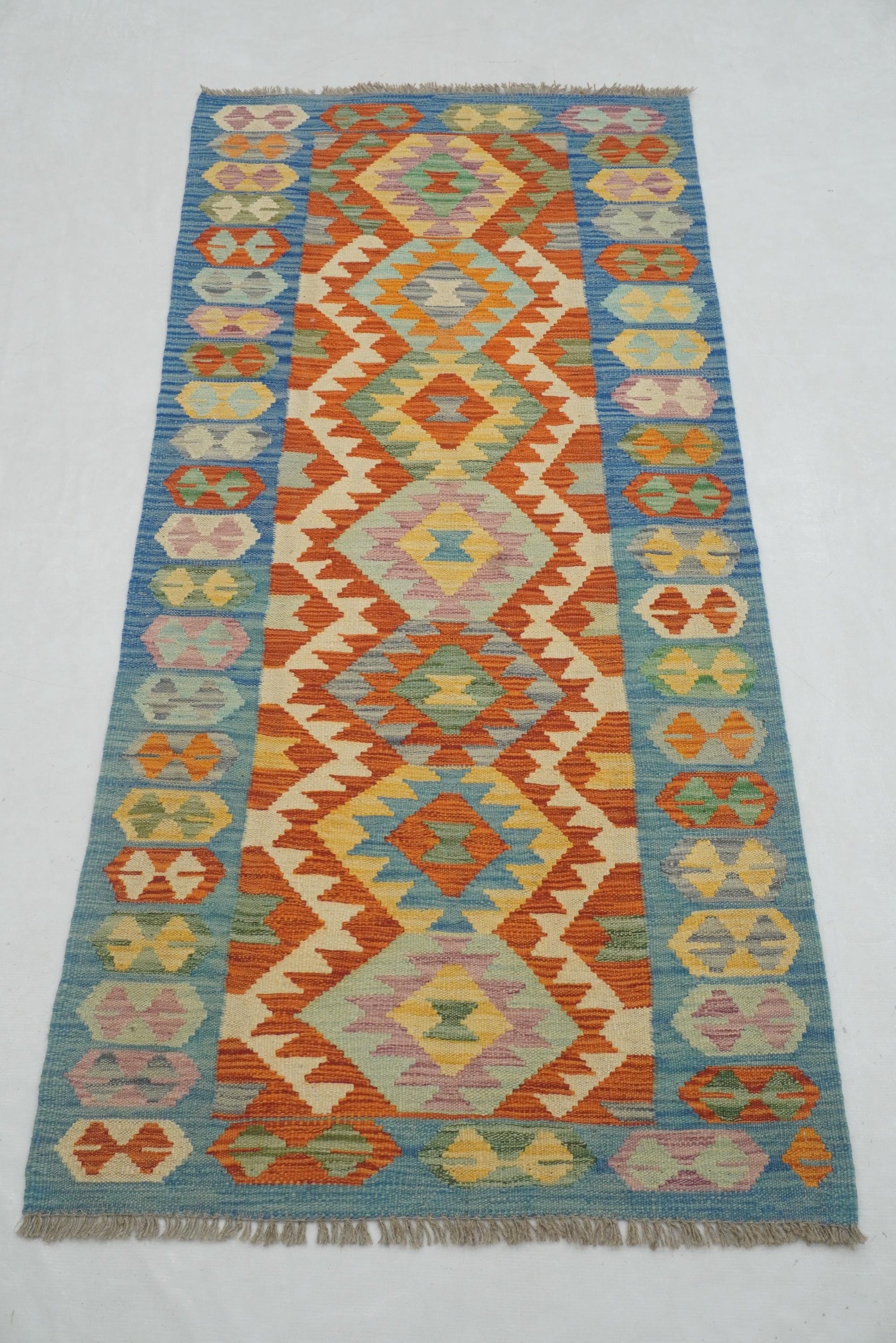 8 ft Blue Mamluk Hand knotted Wool Afghan Medallion Runner Rug