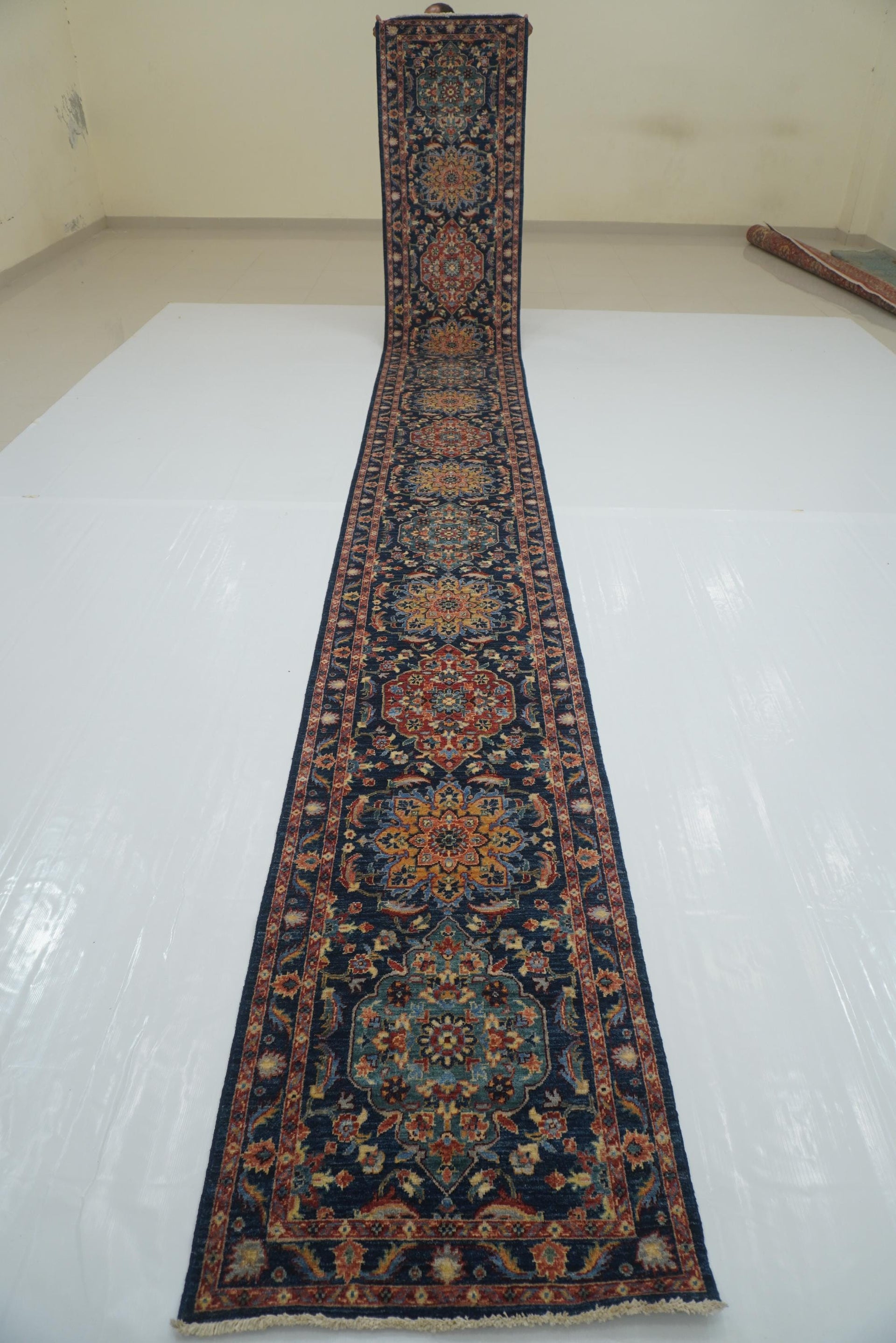 23 ft Blue Karaja Afghan Hand knotted Long Runner Rug