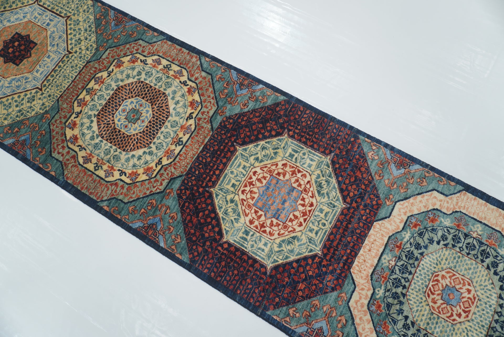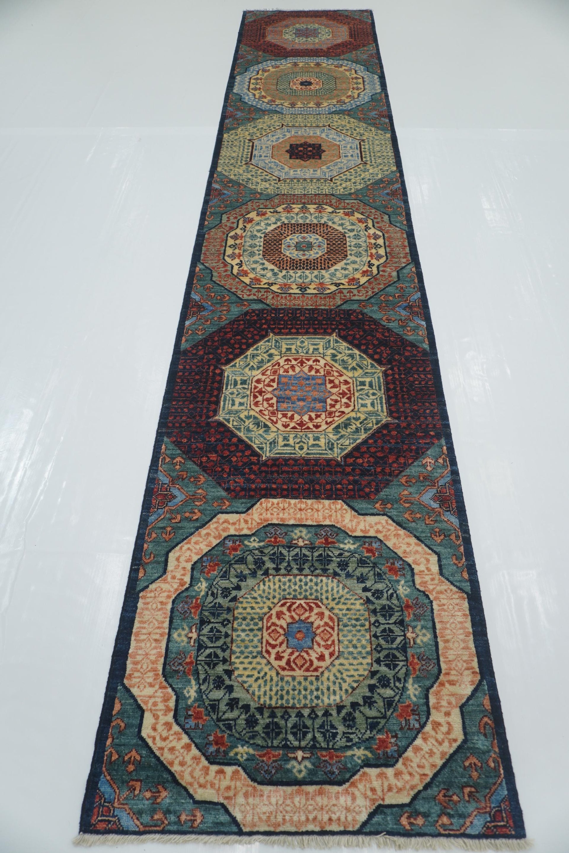 25 ft Blue Green Mamluk Afghan Hand knotted Long Runner Rug