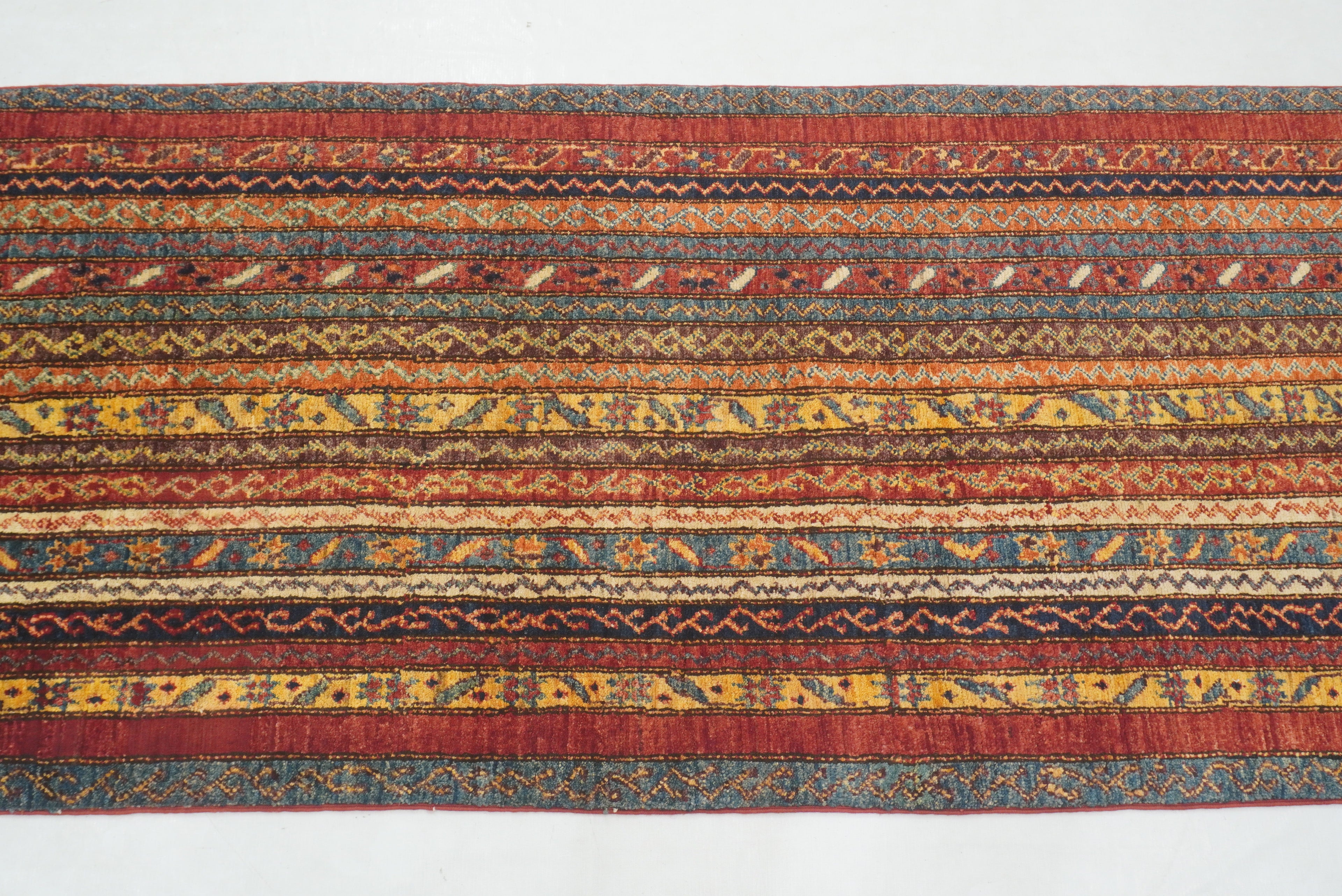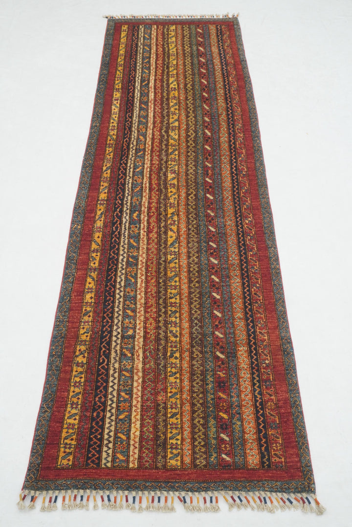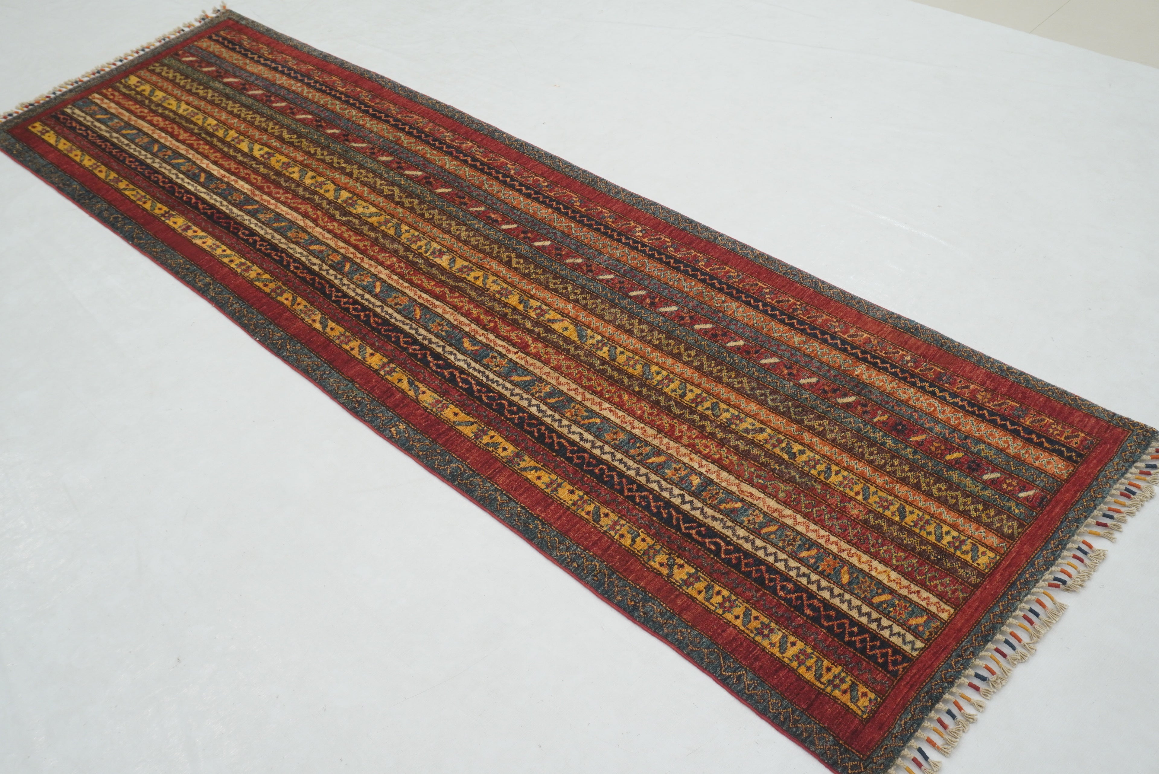 10 ft Red Turkish Shawl Striped Pattern Hand knotted Runner Rug