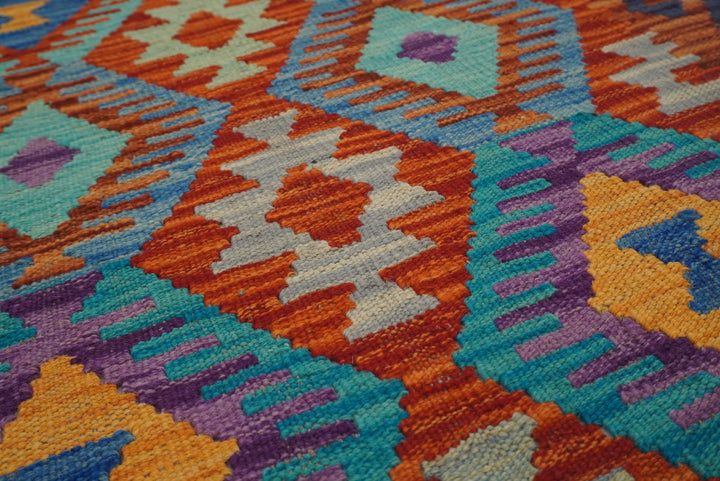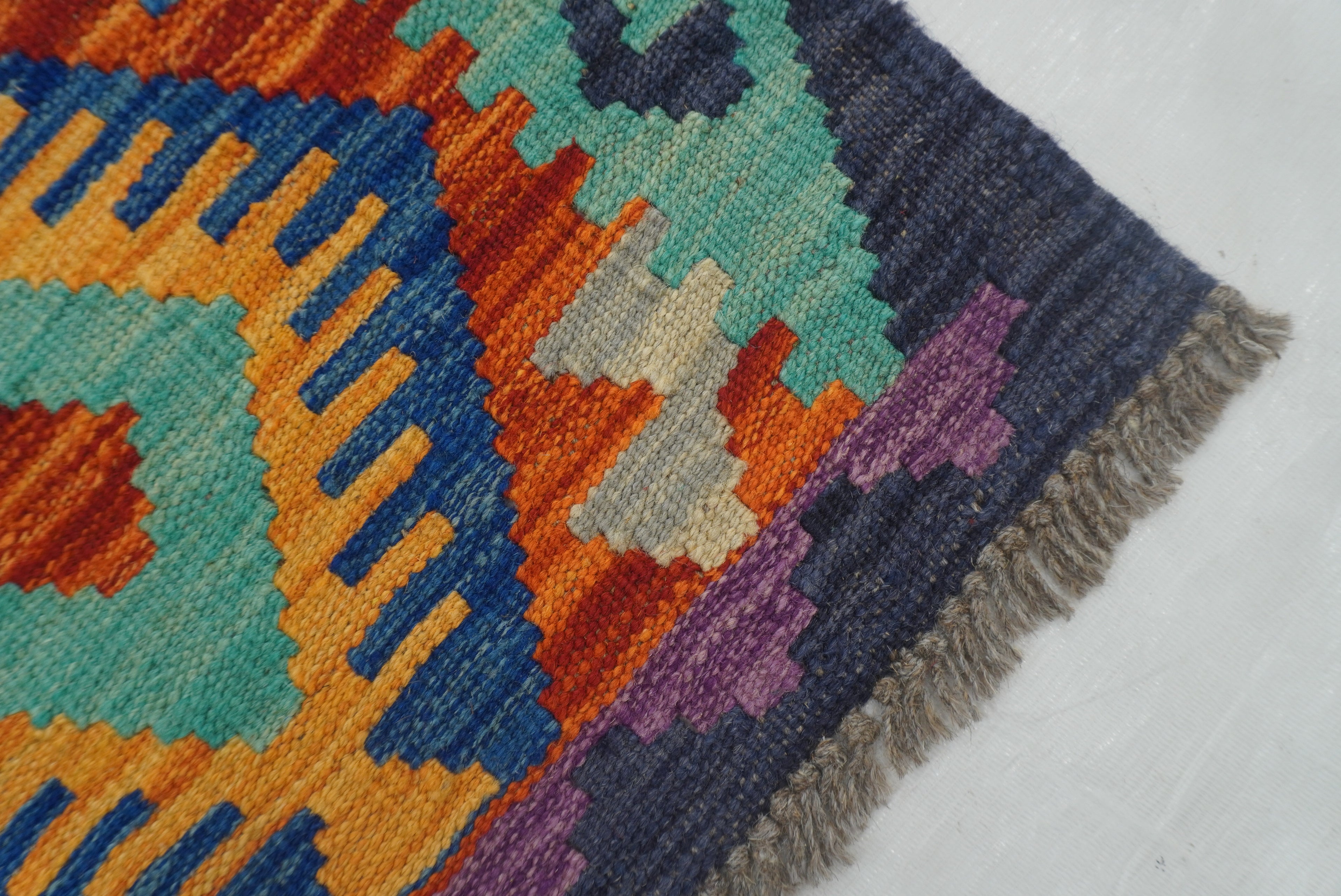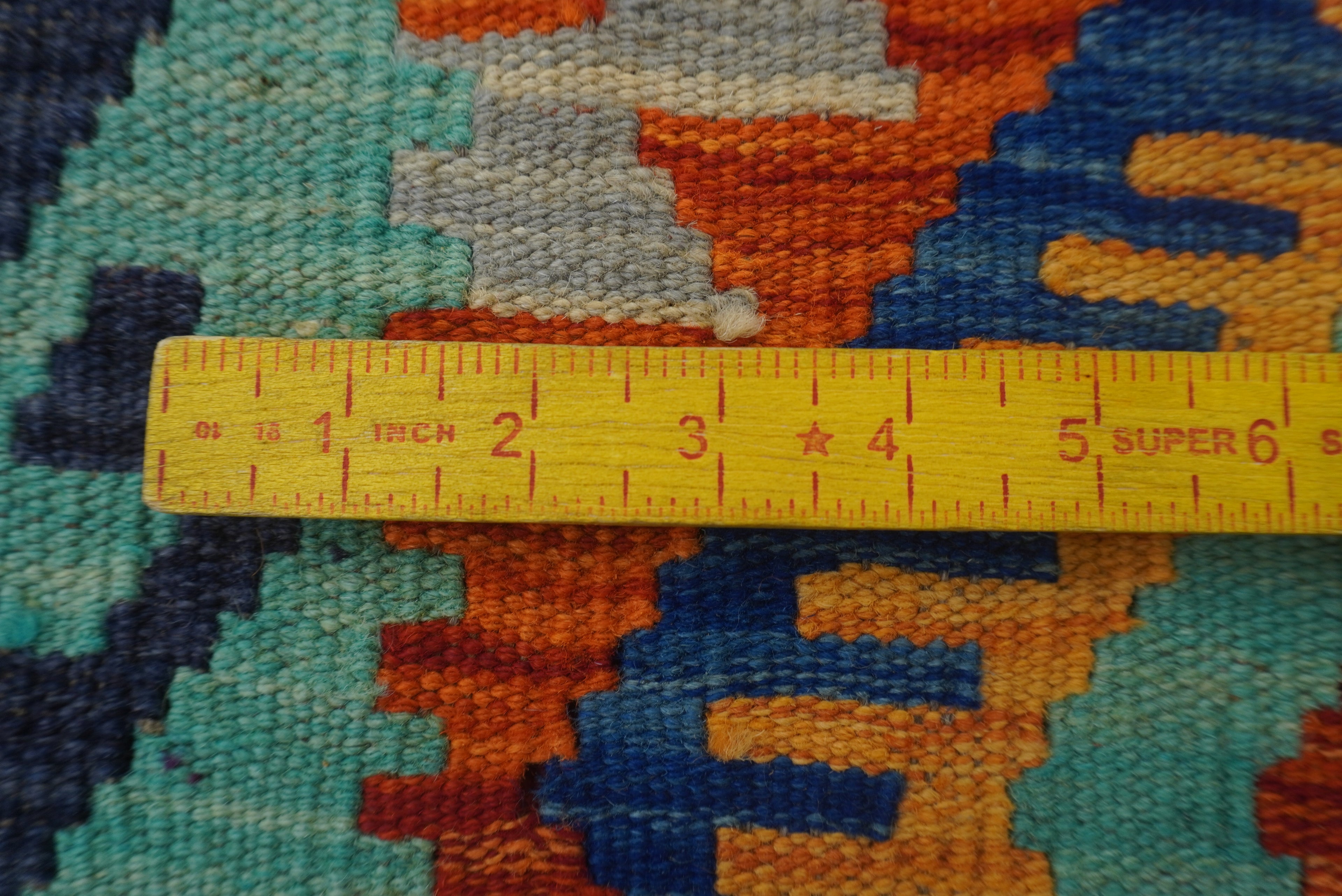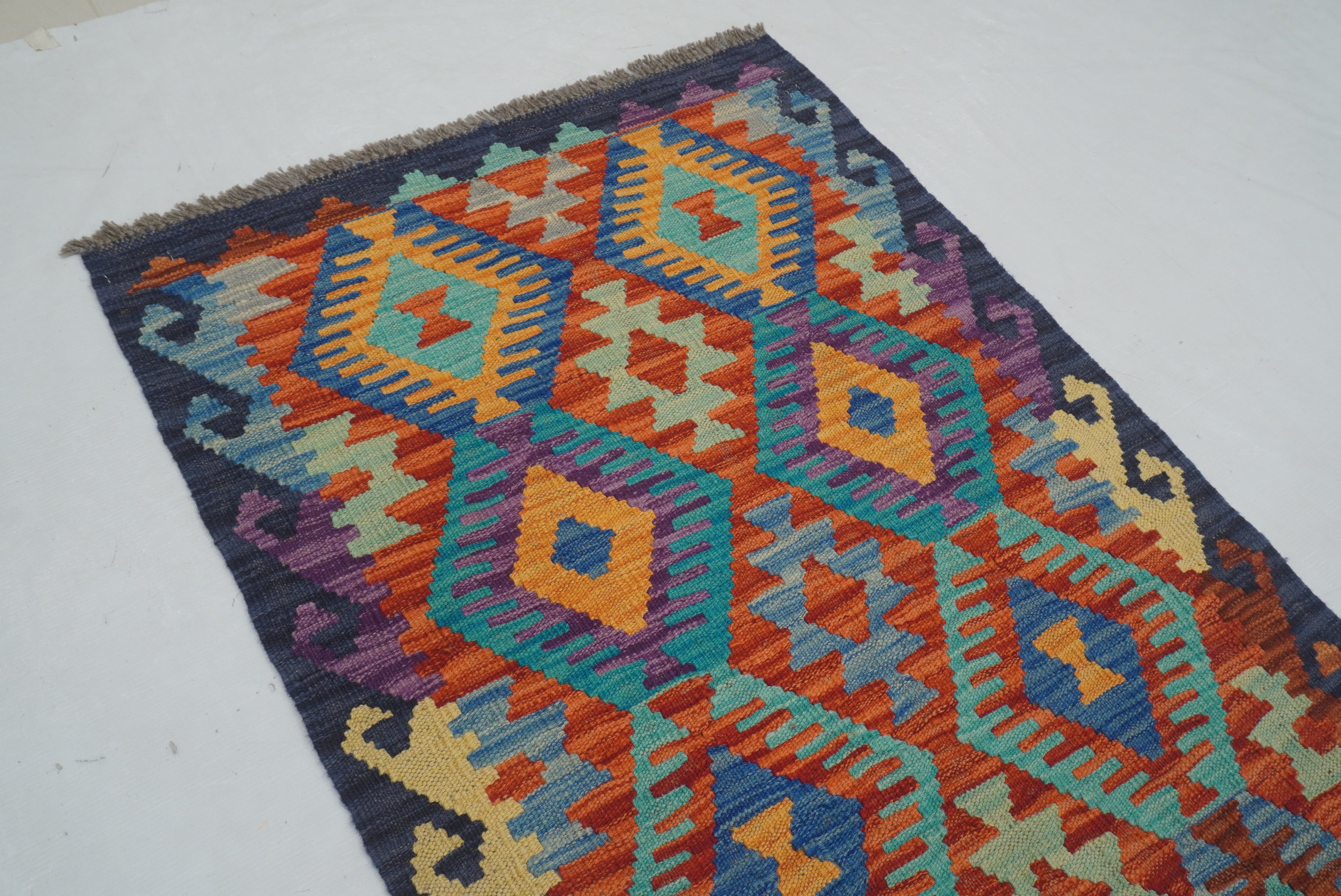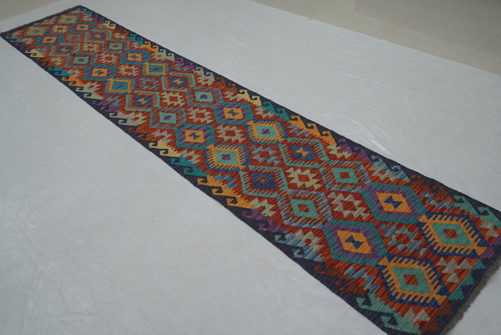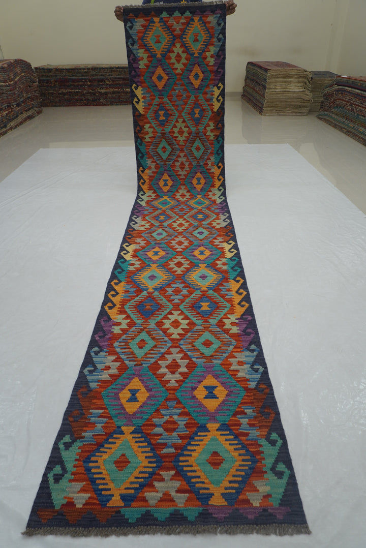 13 Ft Navy Blue Kilim Afghan Maimana Hand Woven Geometric Runner Rug