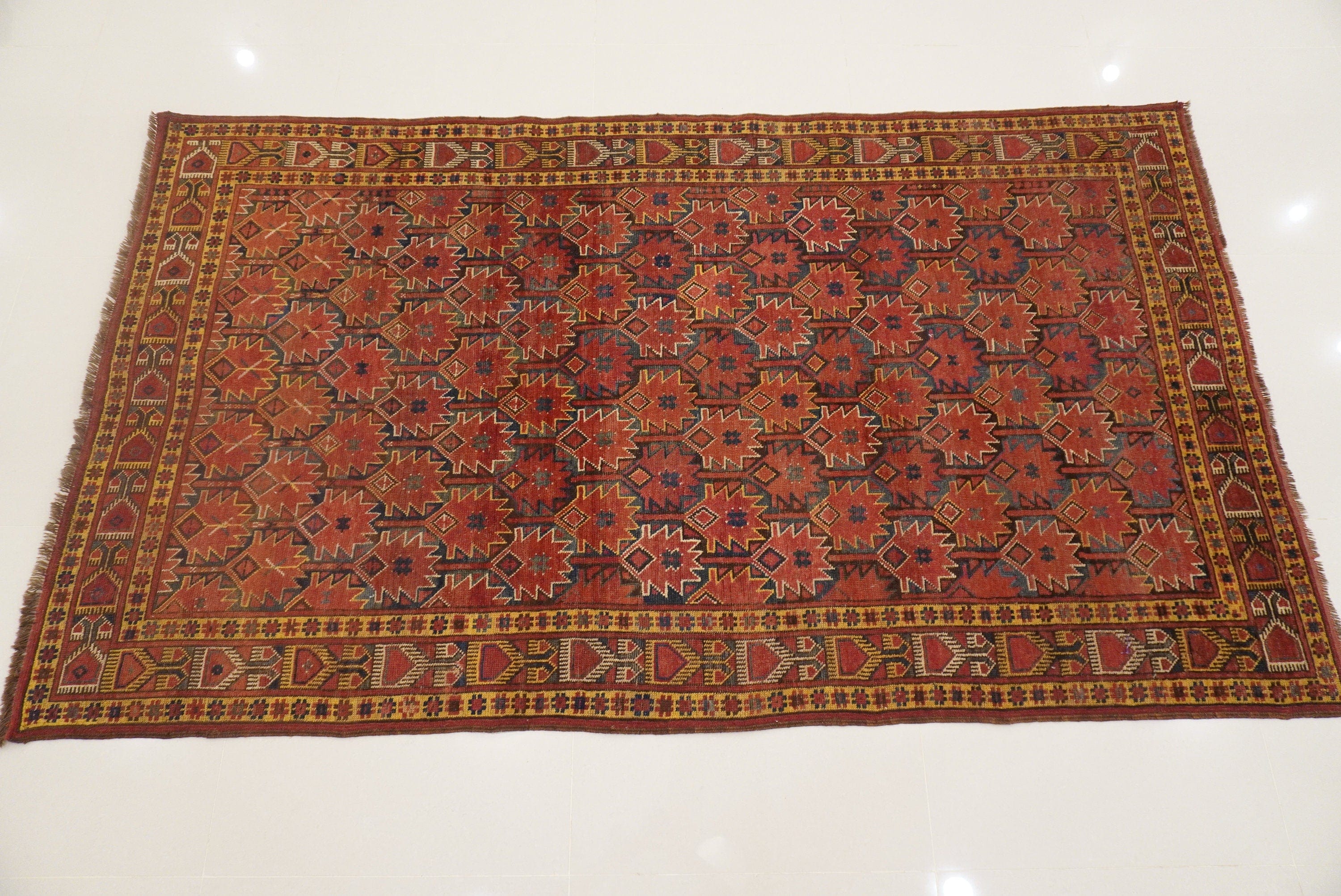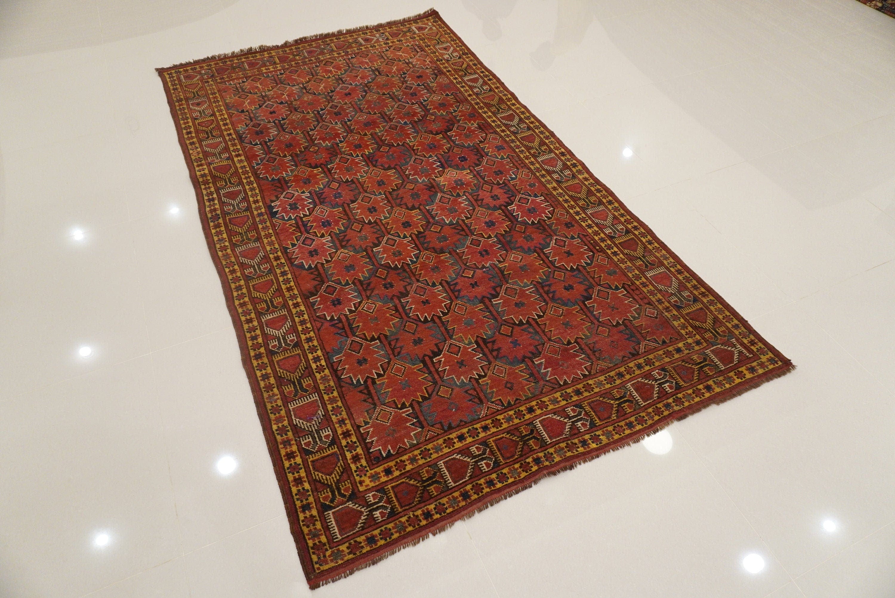 There might be imperfection and minor flaws because of age and handmade weaving which are not consider defect. Which is the real beauty of handmade rugs and gives a unique character to each rug.