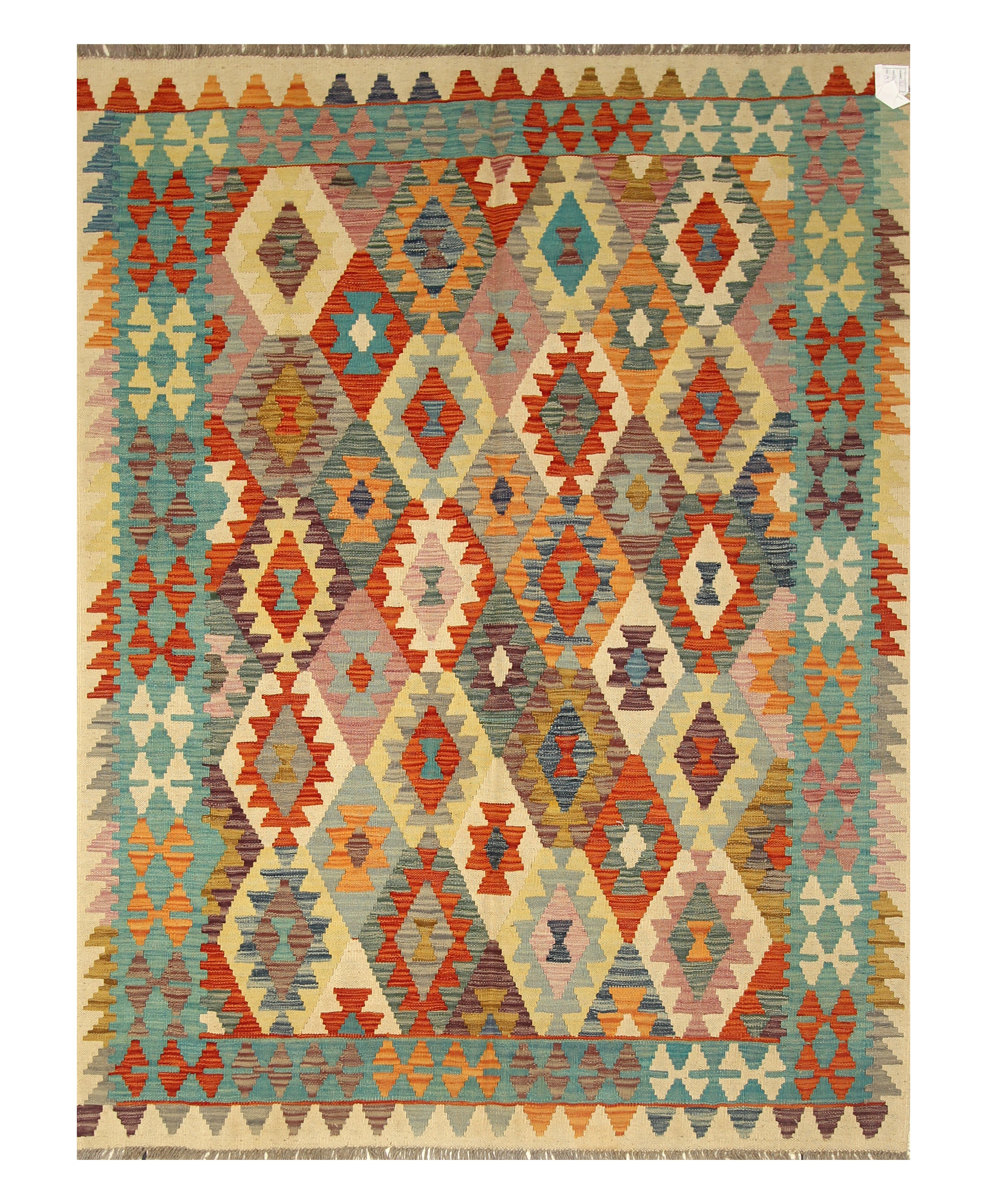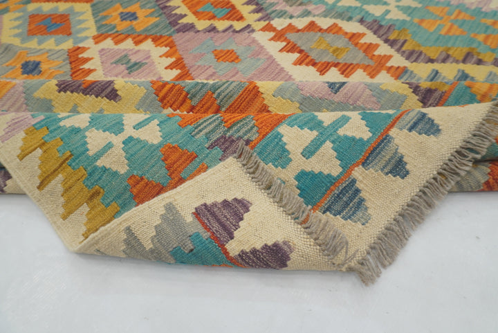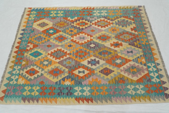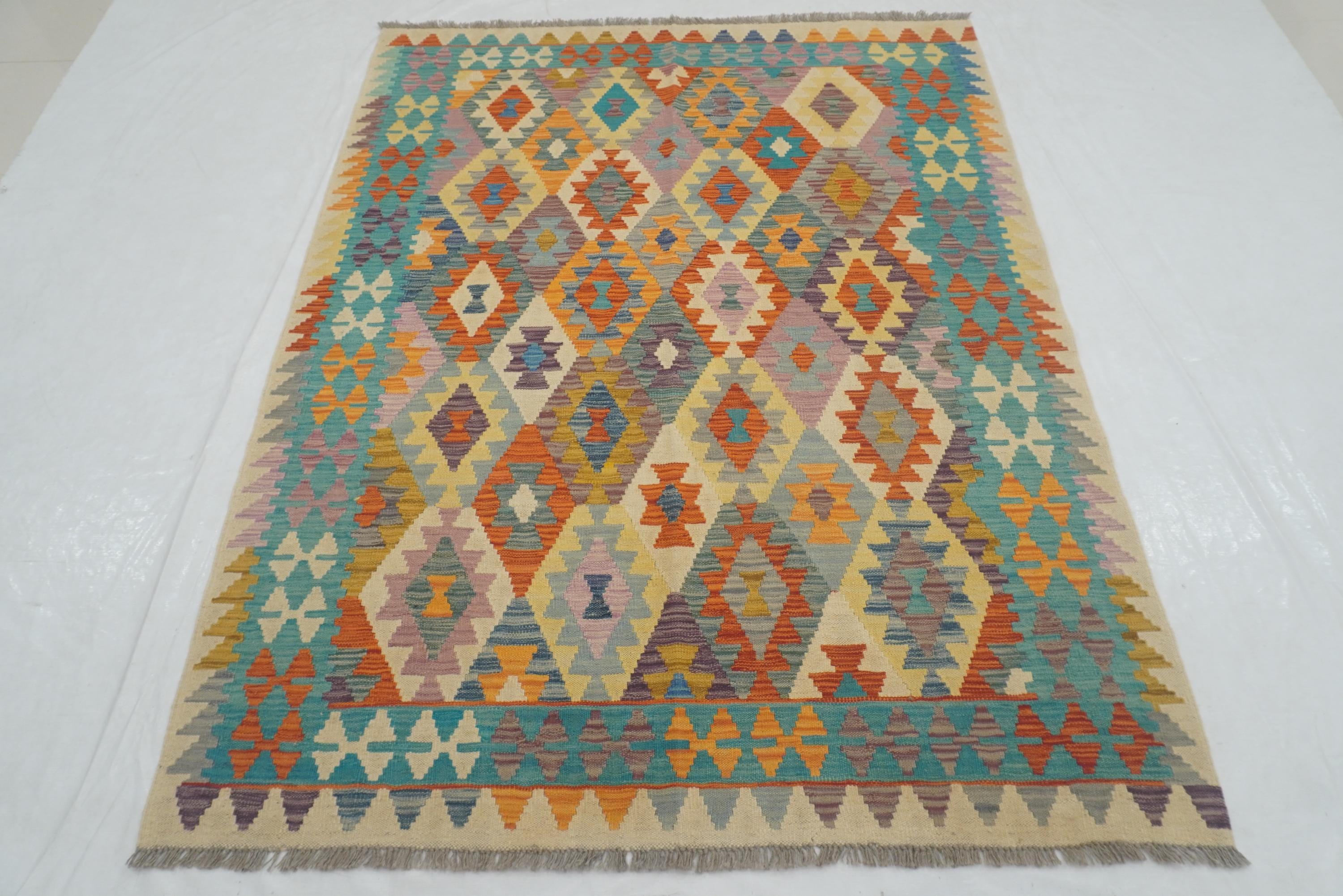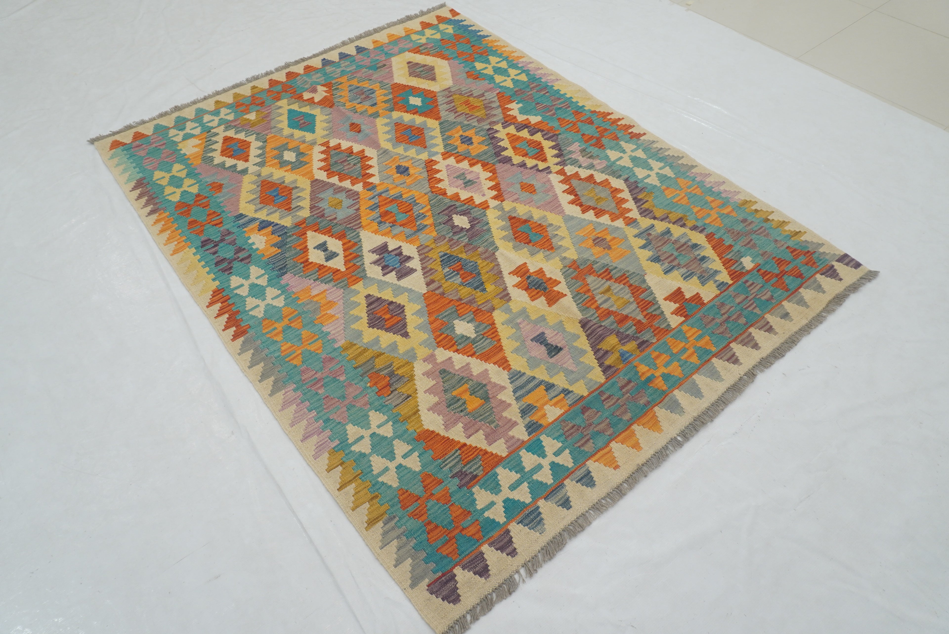 5x7 Beige Turquoise Blue Afghan Geometric Reversible Kilim Rug
