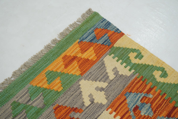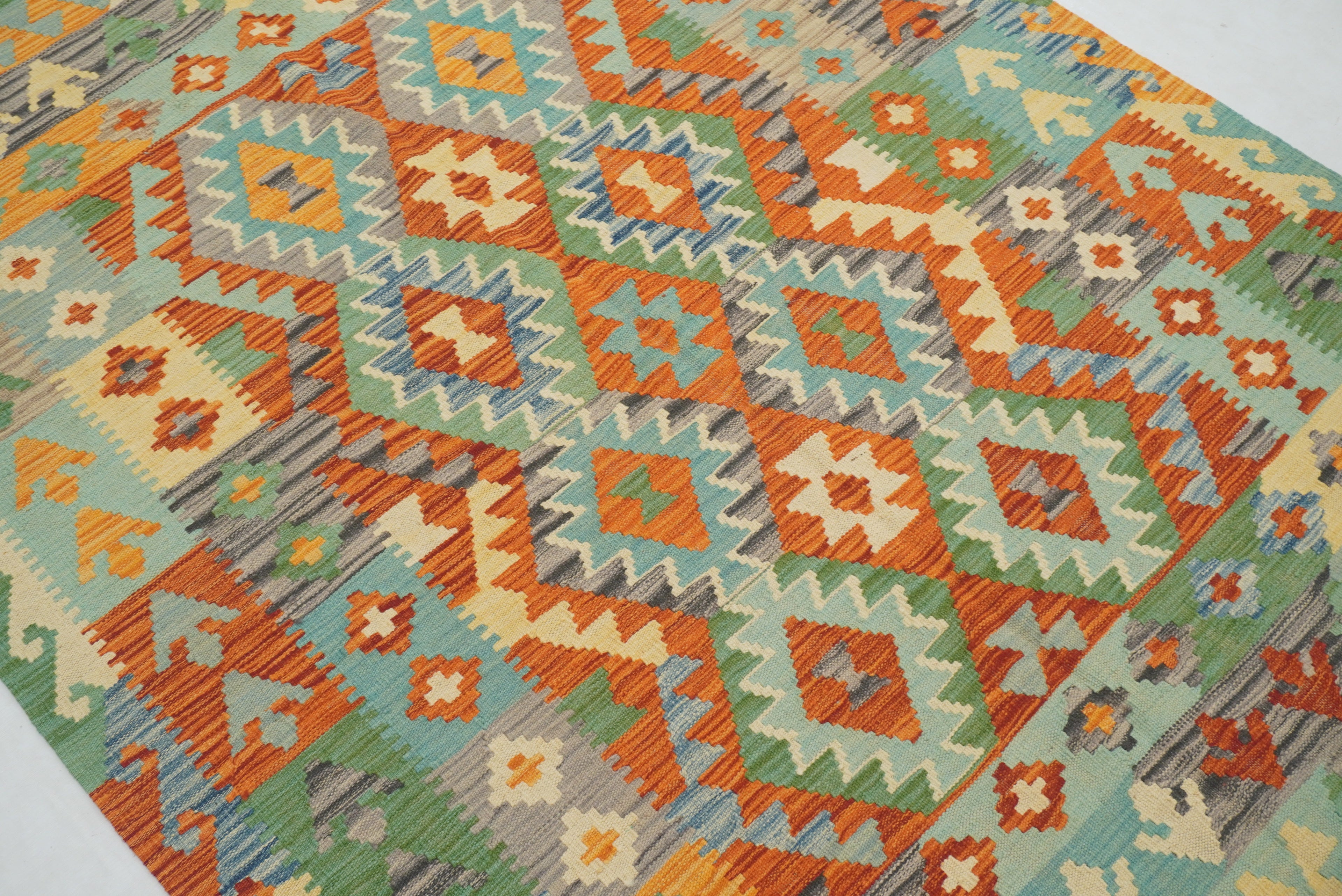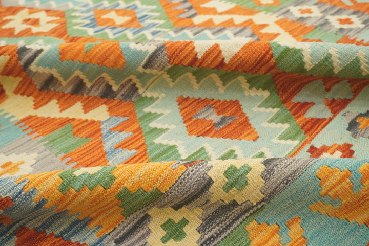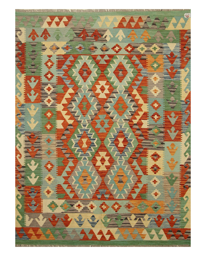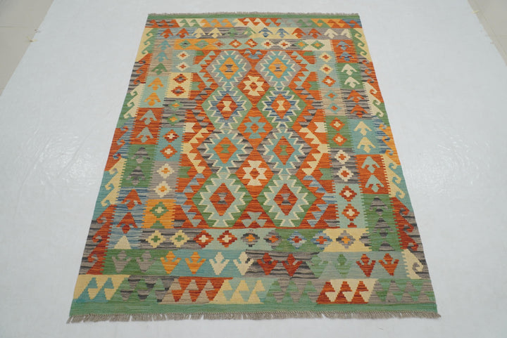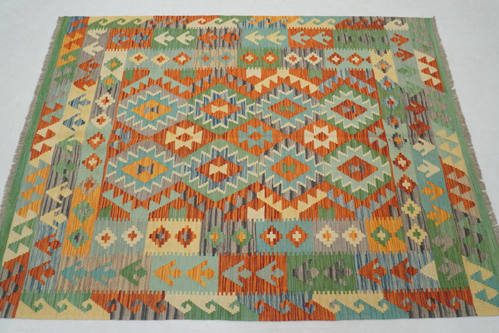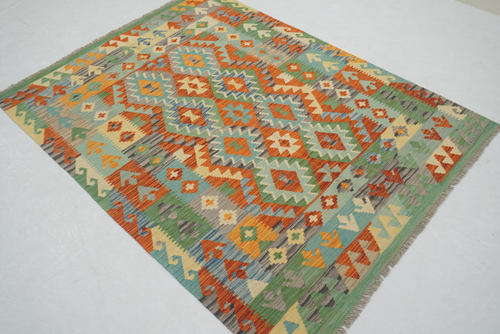 5x7 Green Orange Afghan Handmade Reversible Kilim Rug