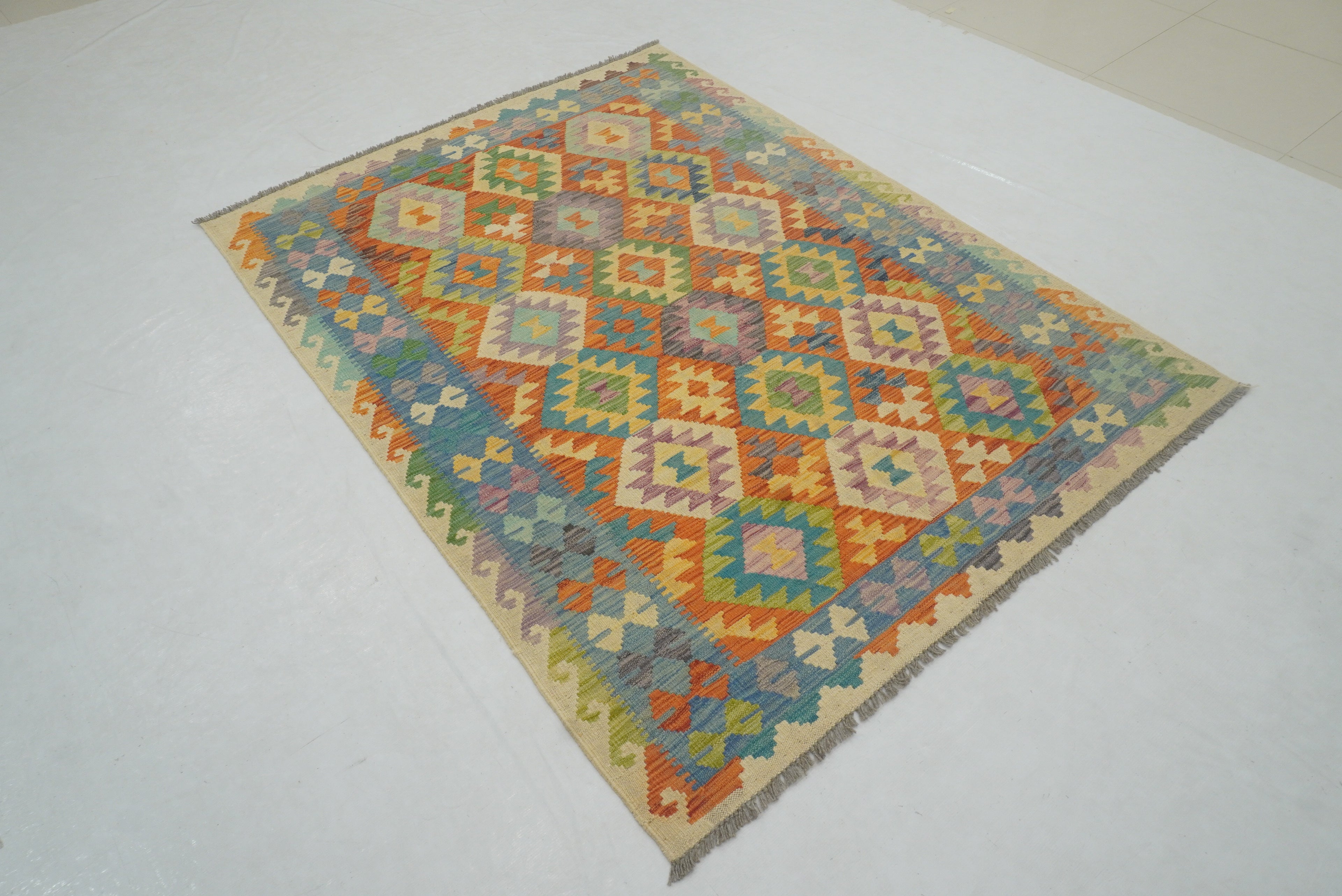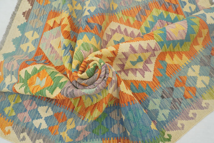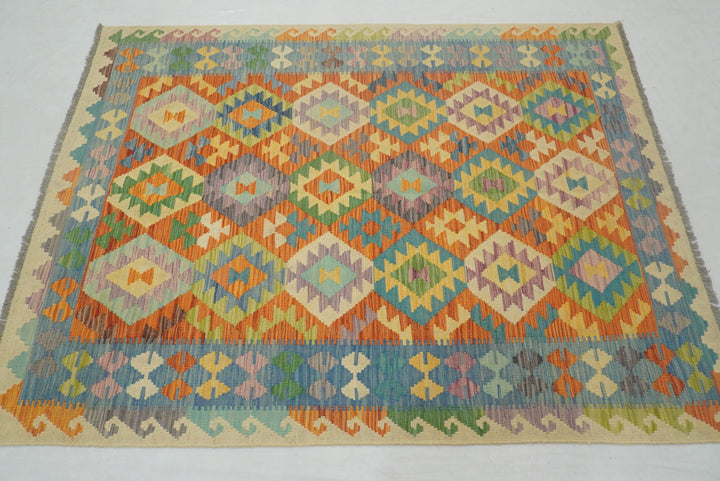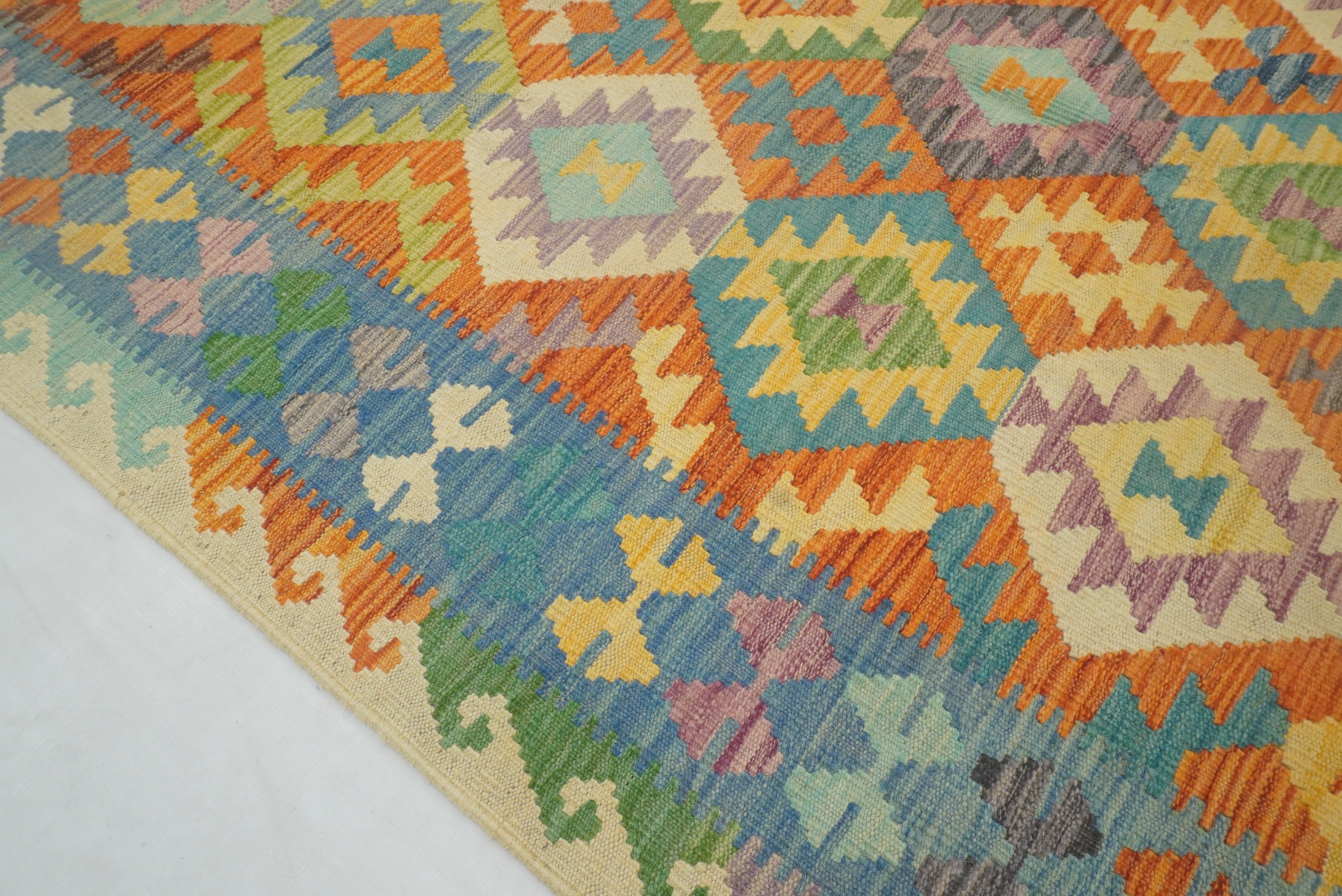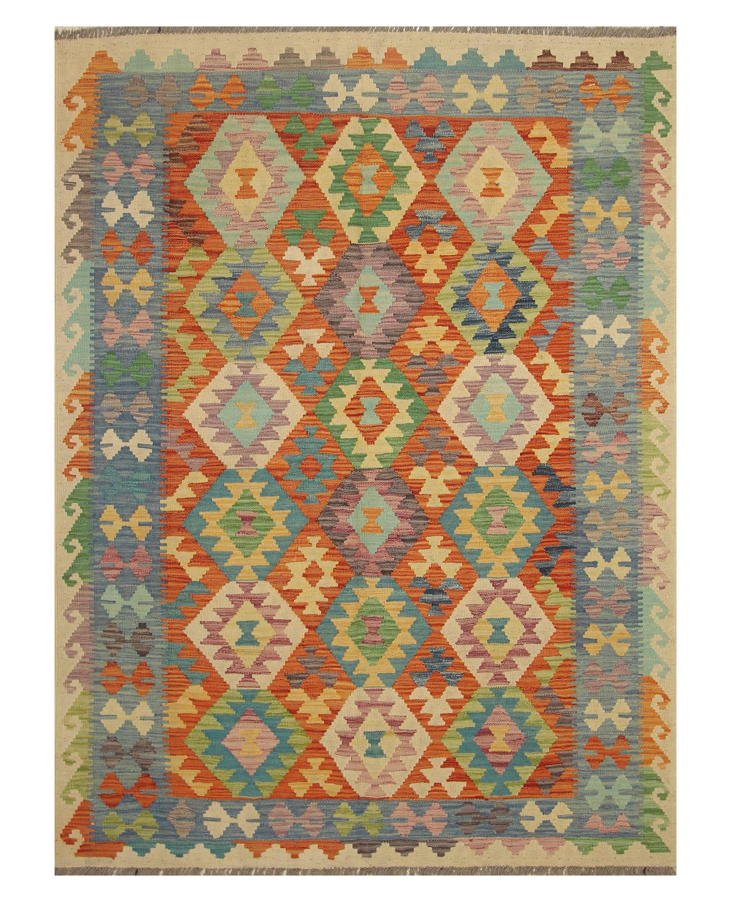5x7 Orange Blue Afghan Handmade Reversible Kilim Rug