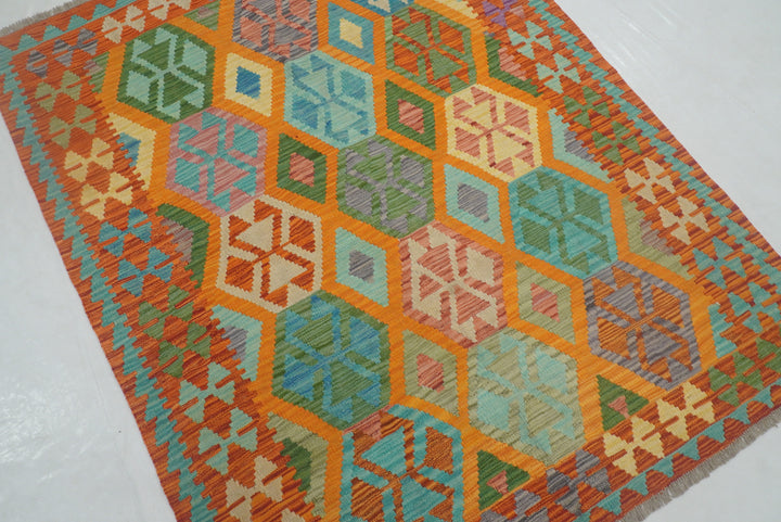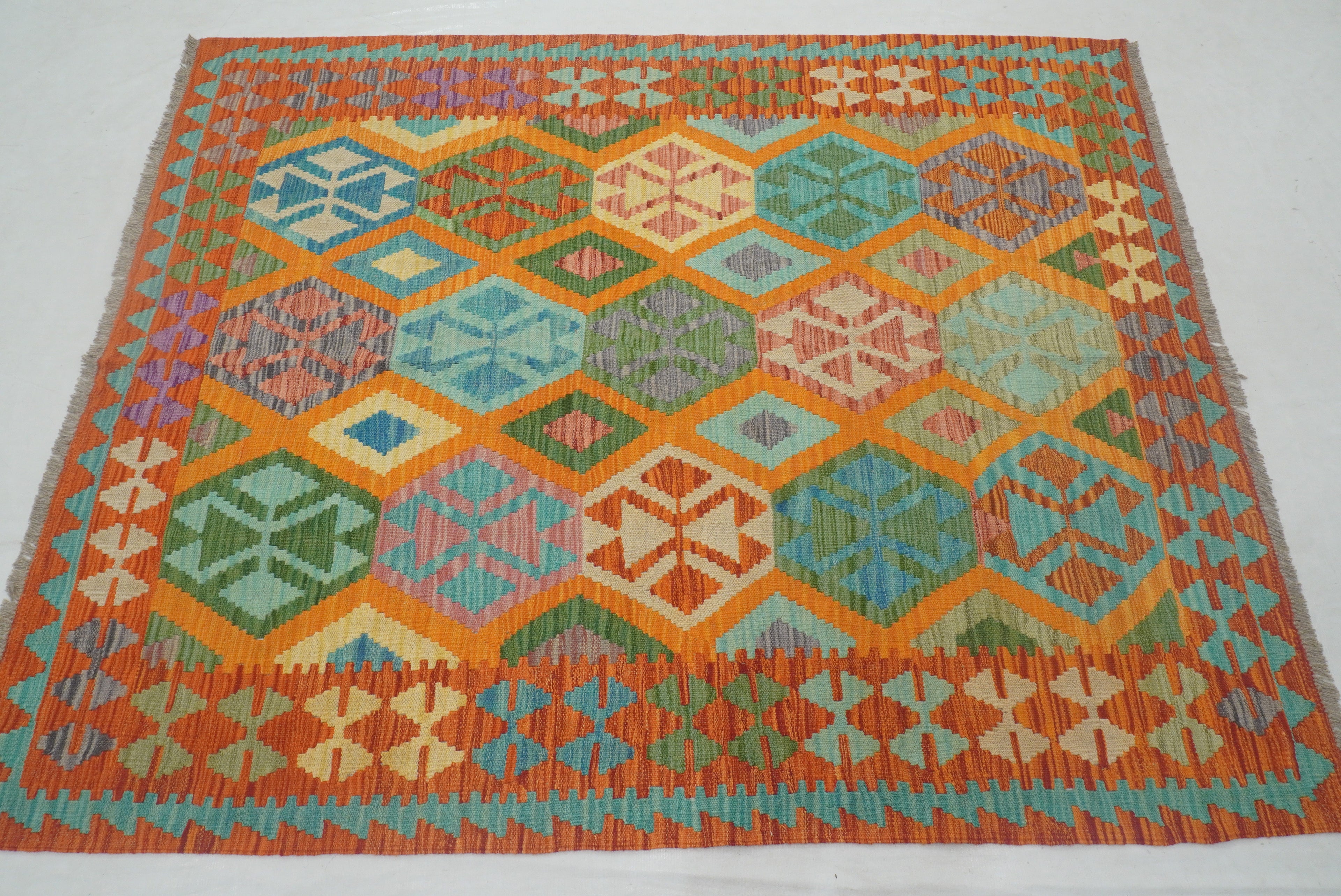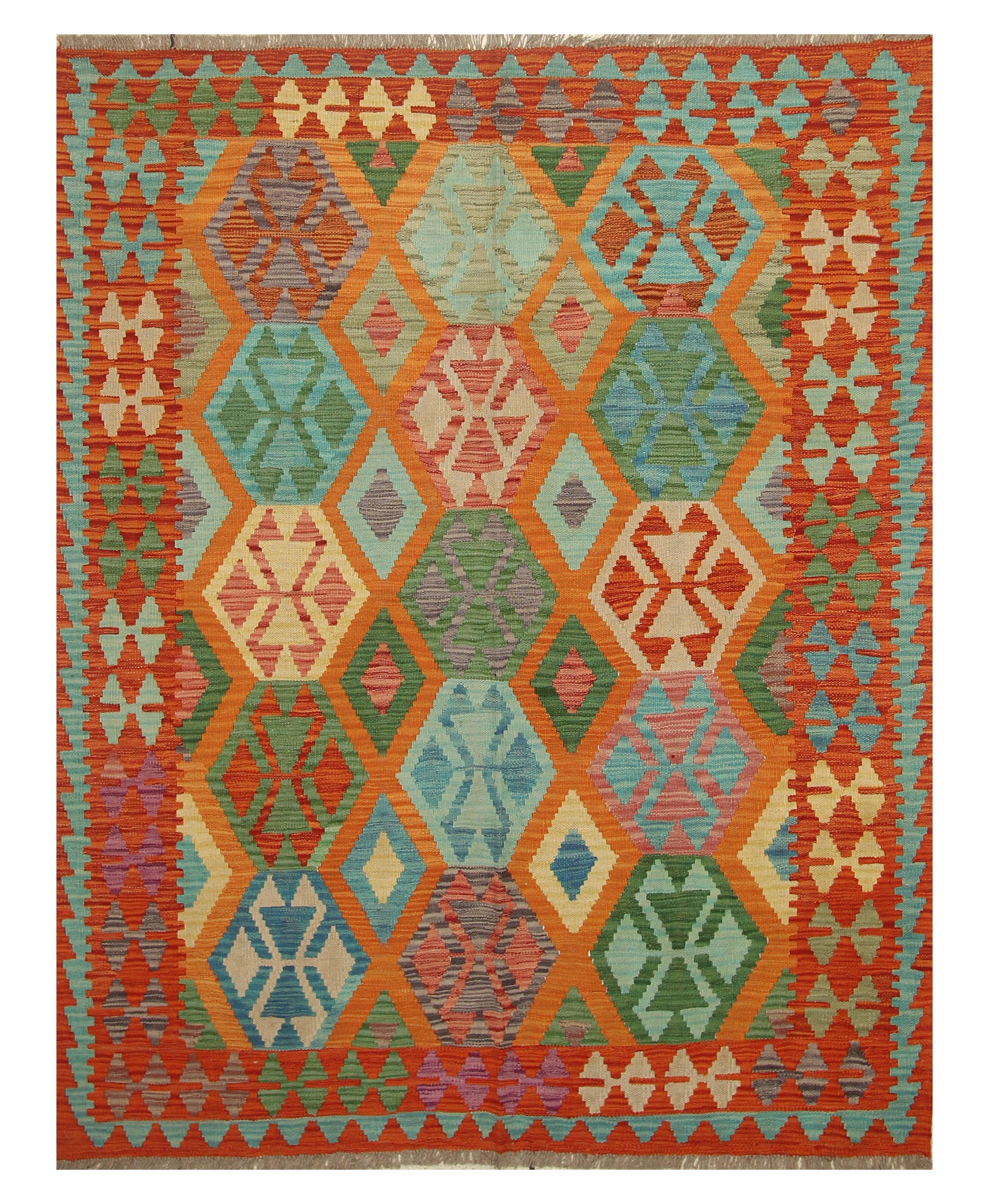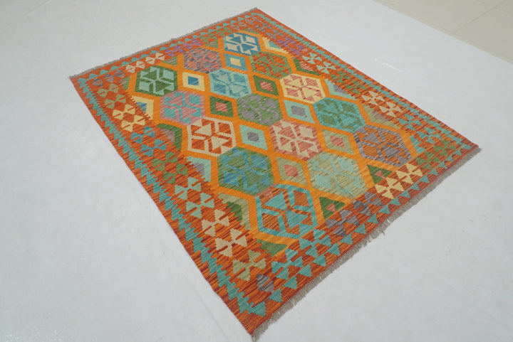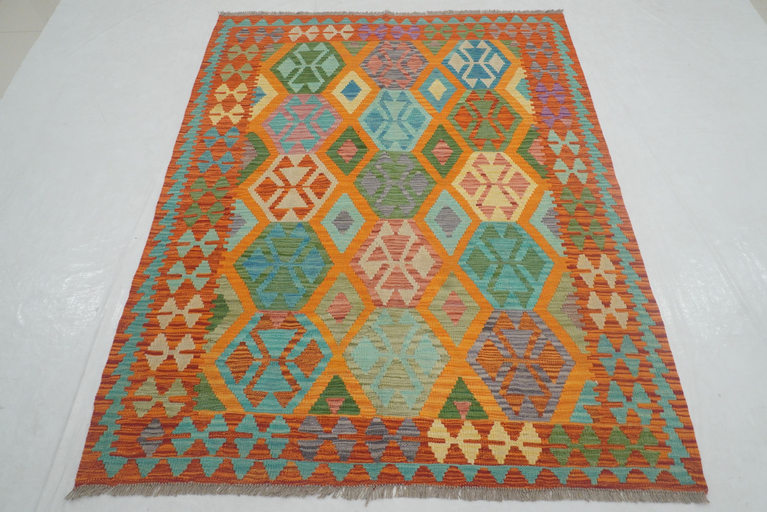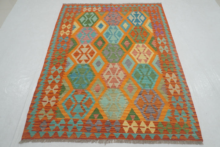 5x7 Orange Red Afghan Geometric Reversible Kilim Rug