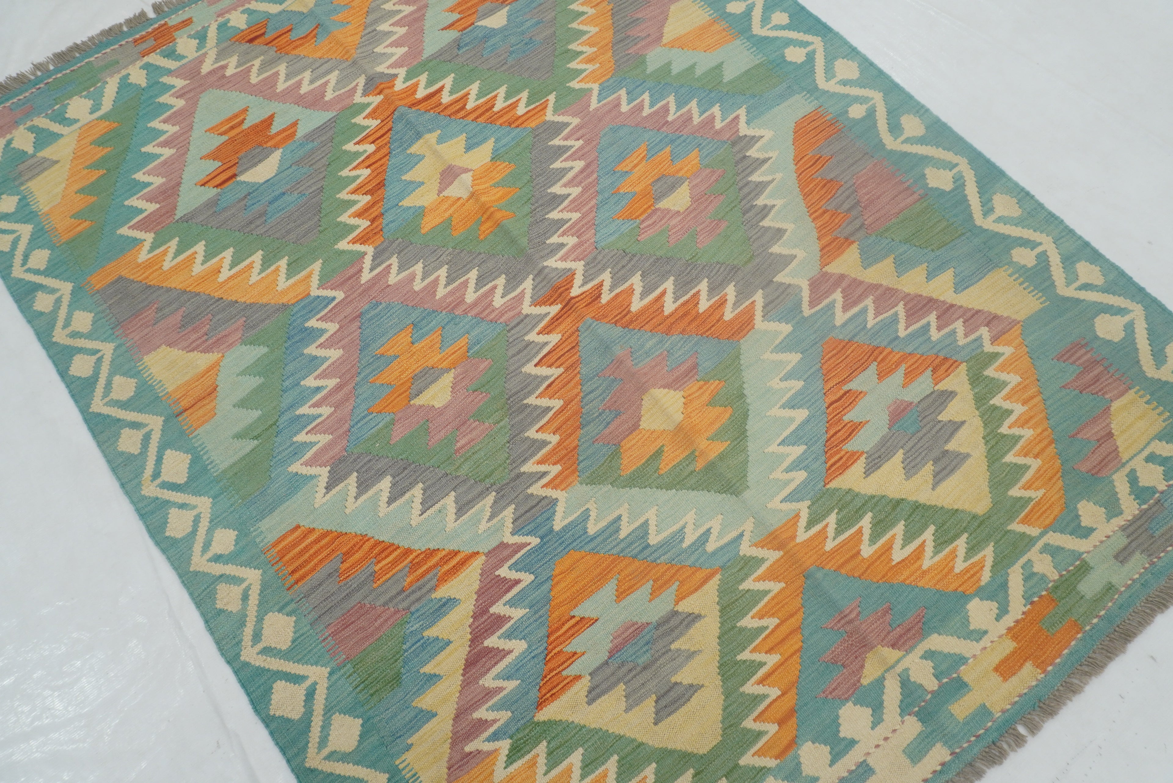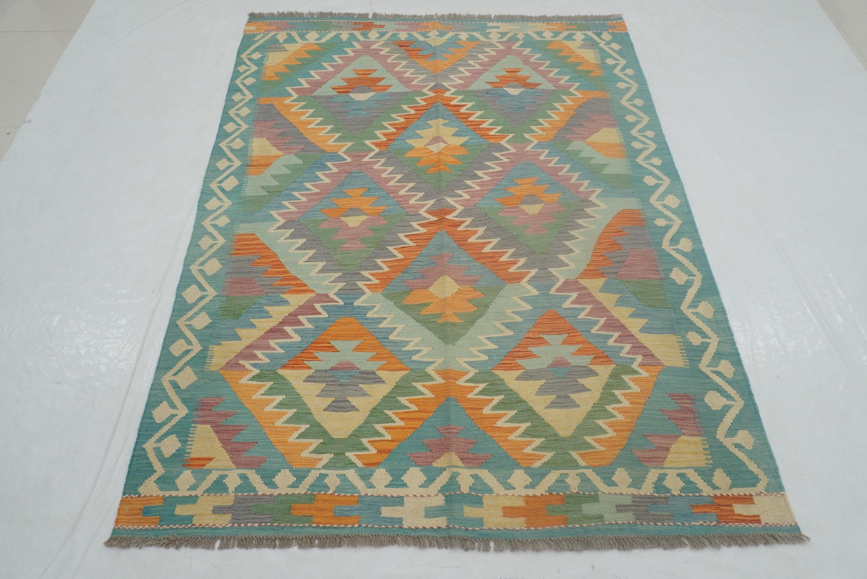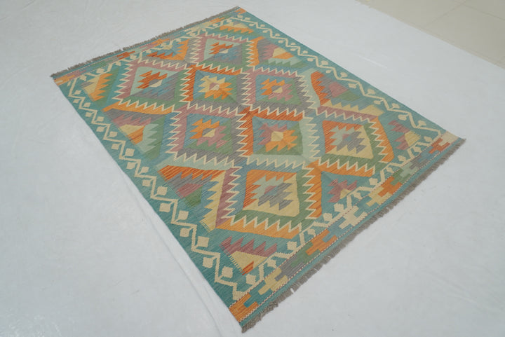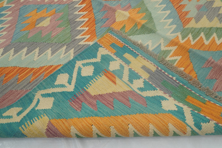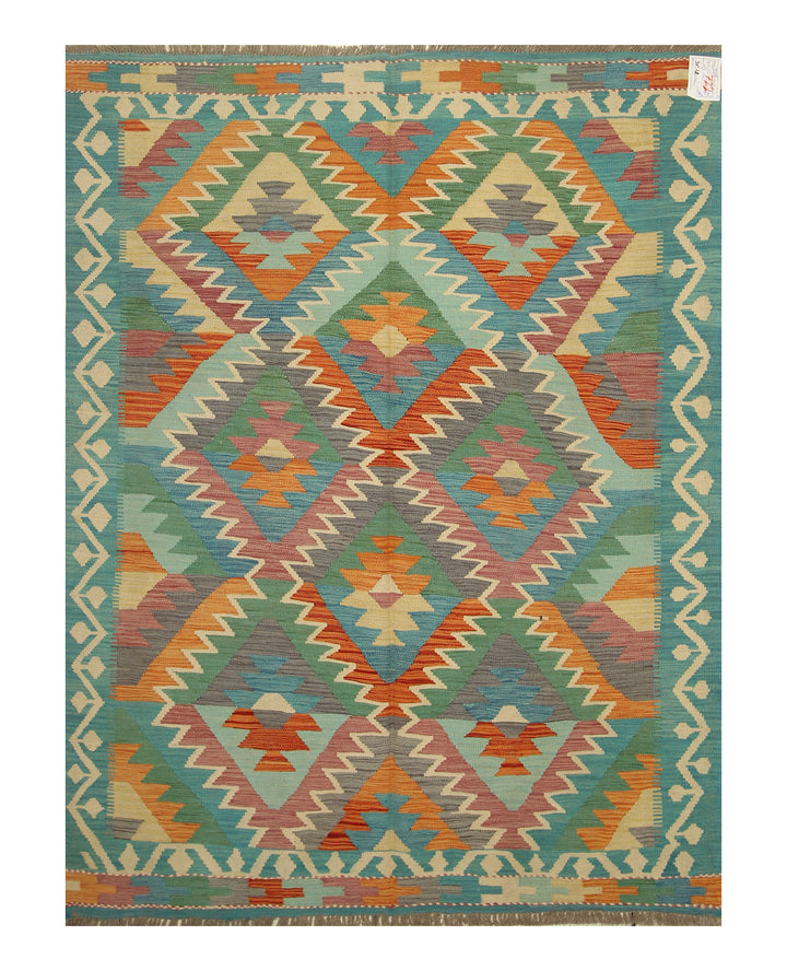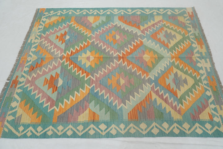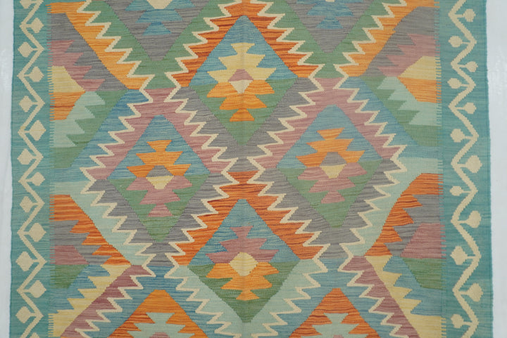 5x7 Turquoise Blue Handmade Geometric Reversible Kilim Rug
