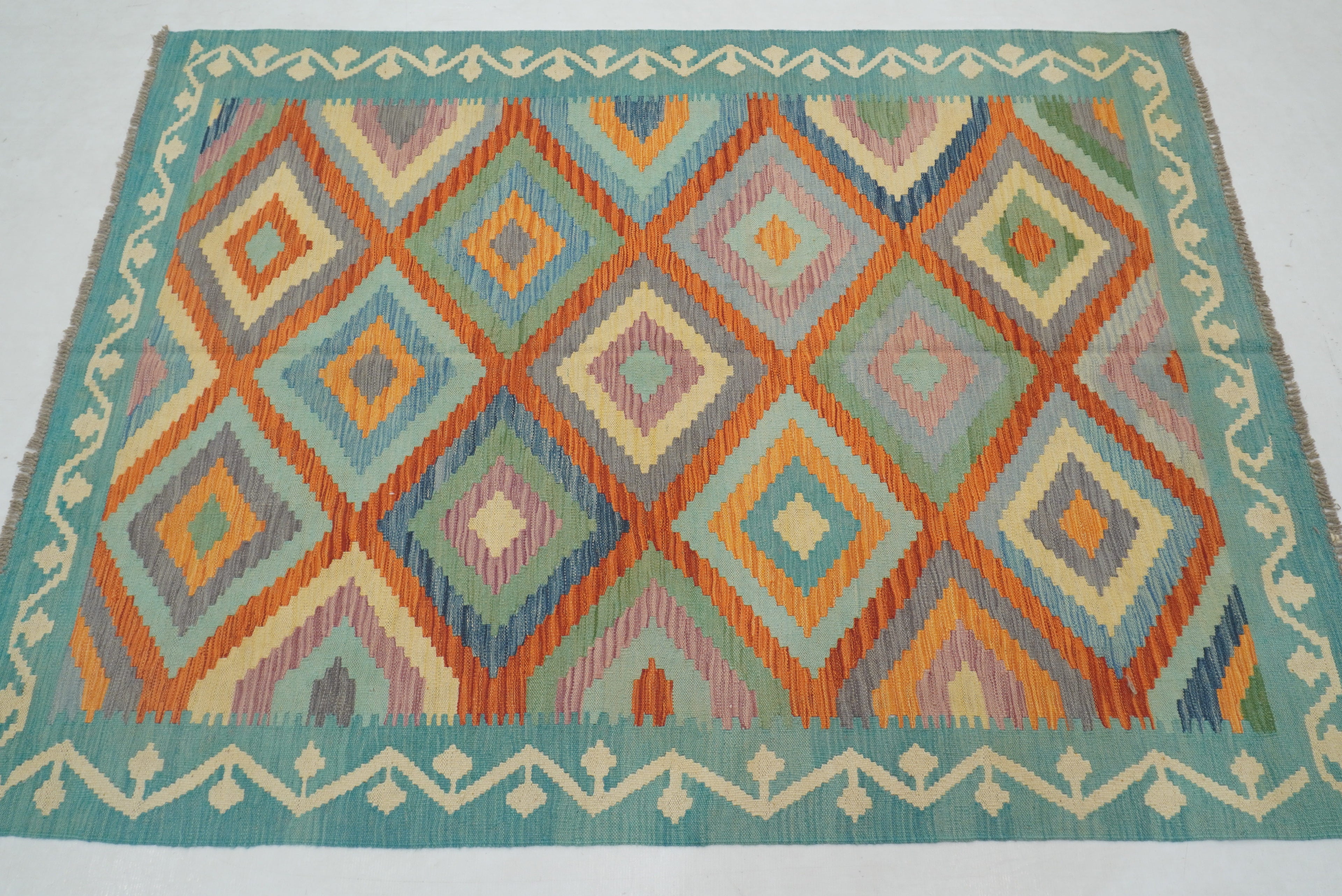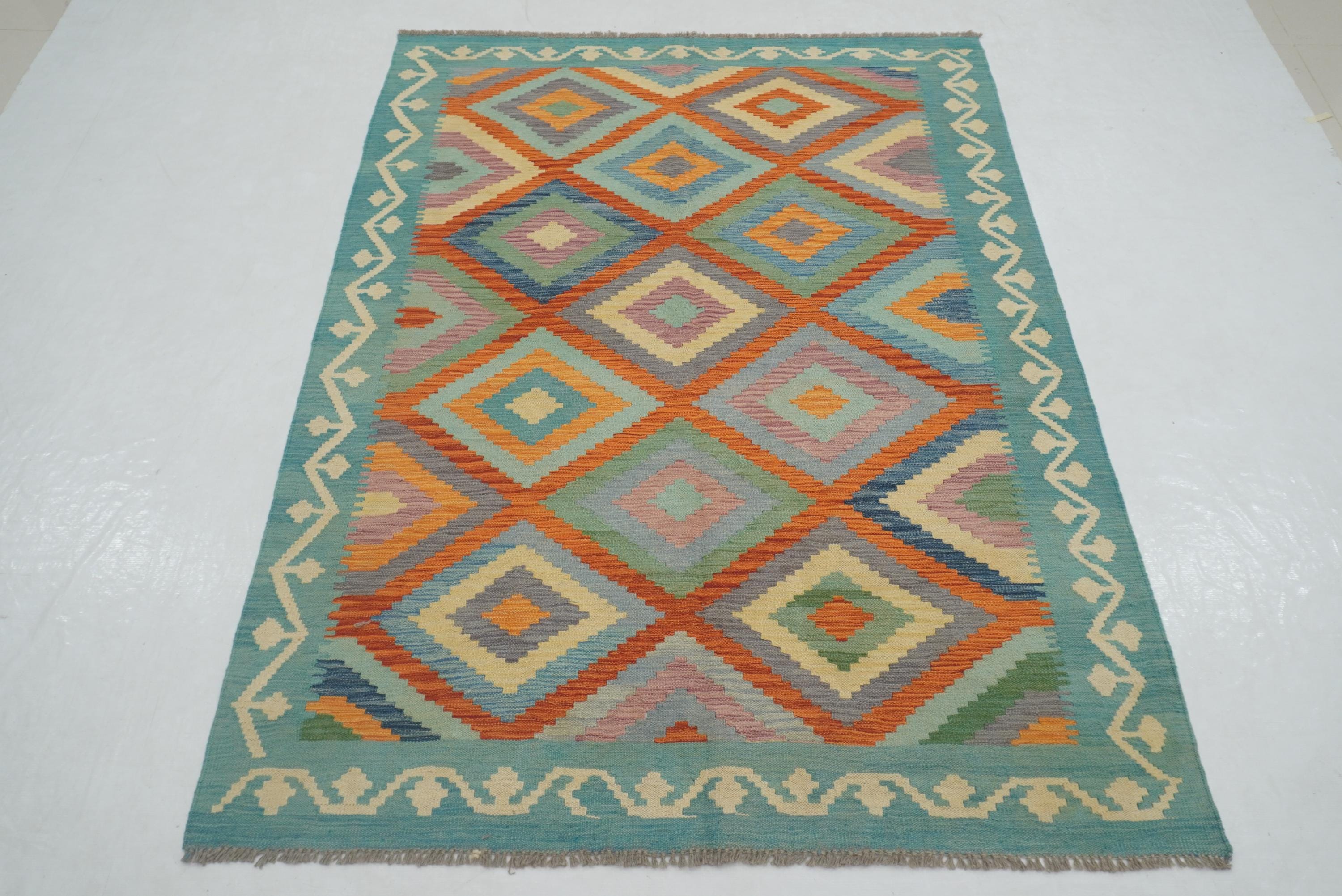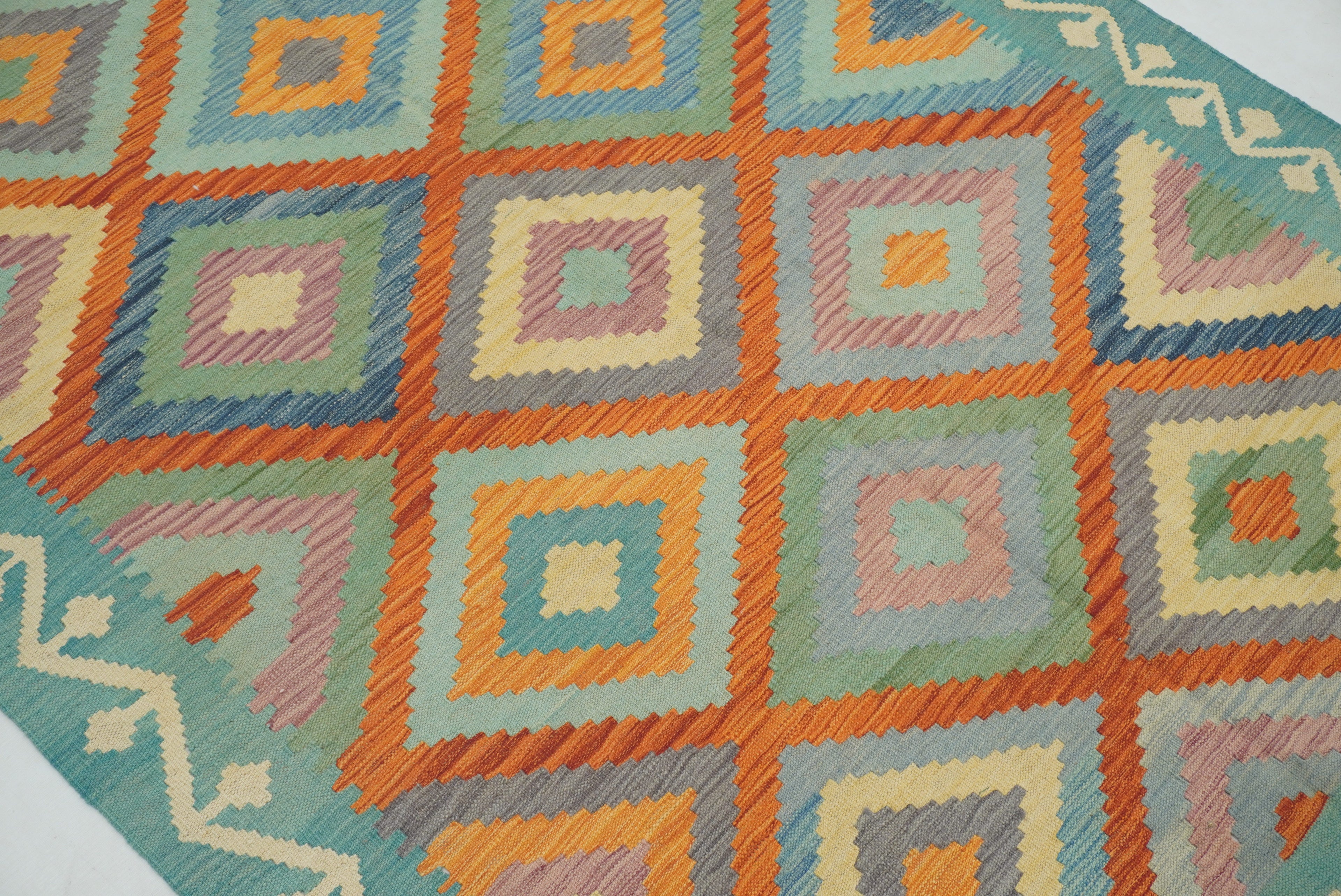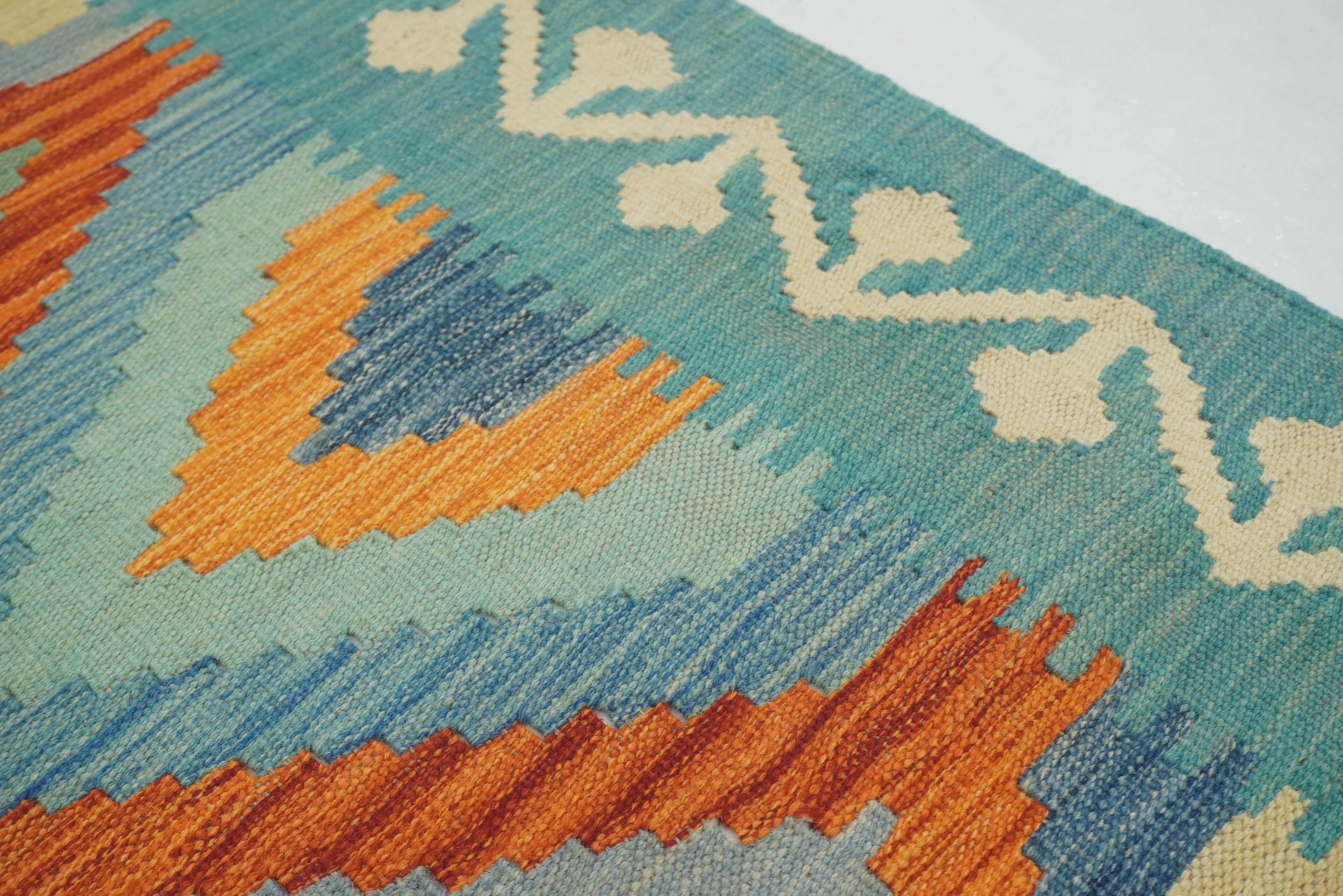 5x7 Turquoise Blue Orange Afghan Handmade Reversible Kilim Rug