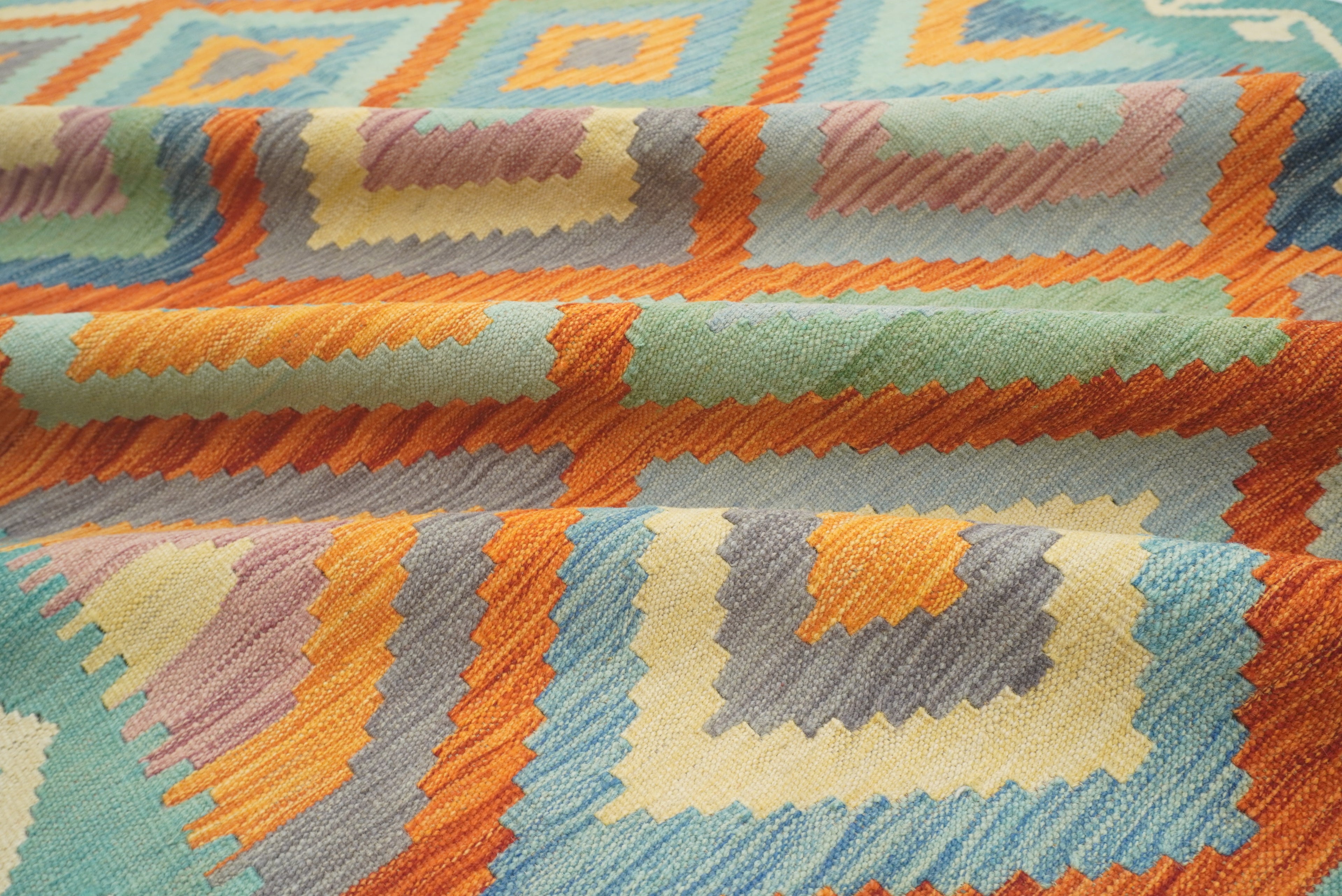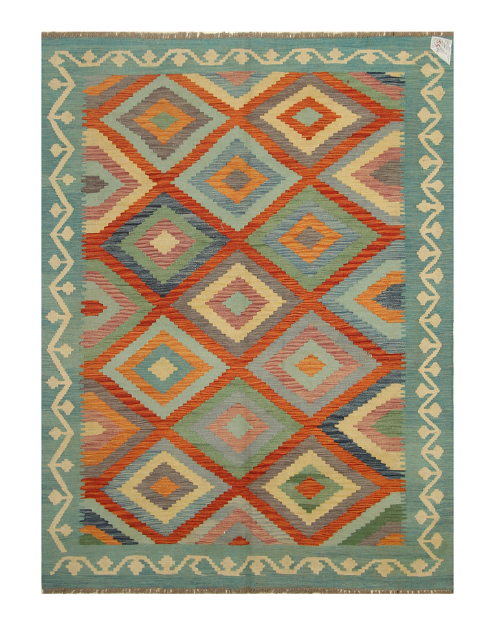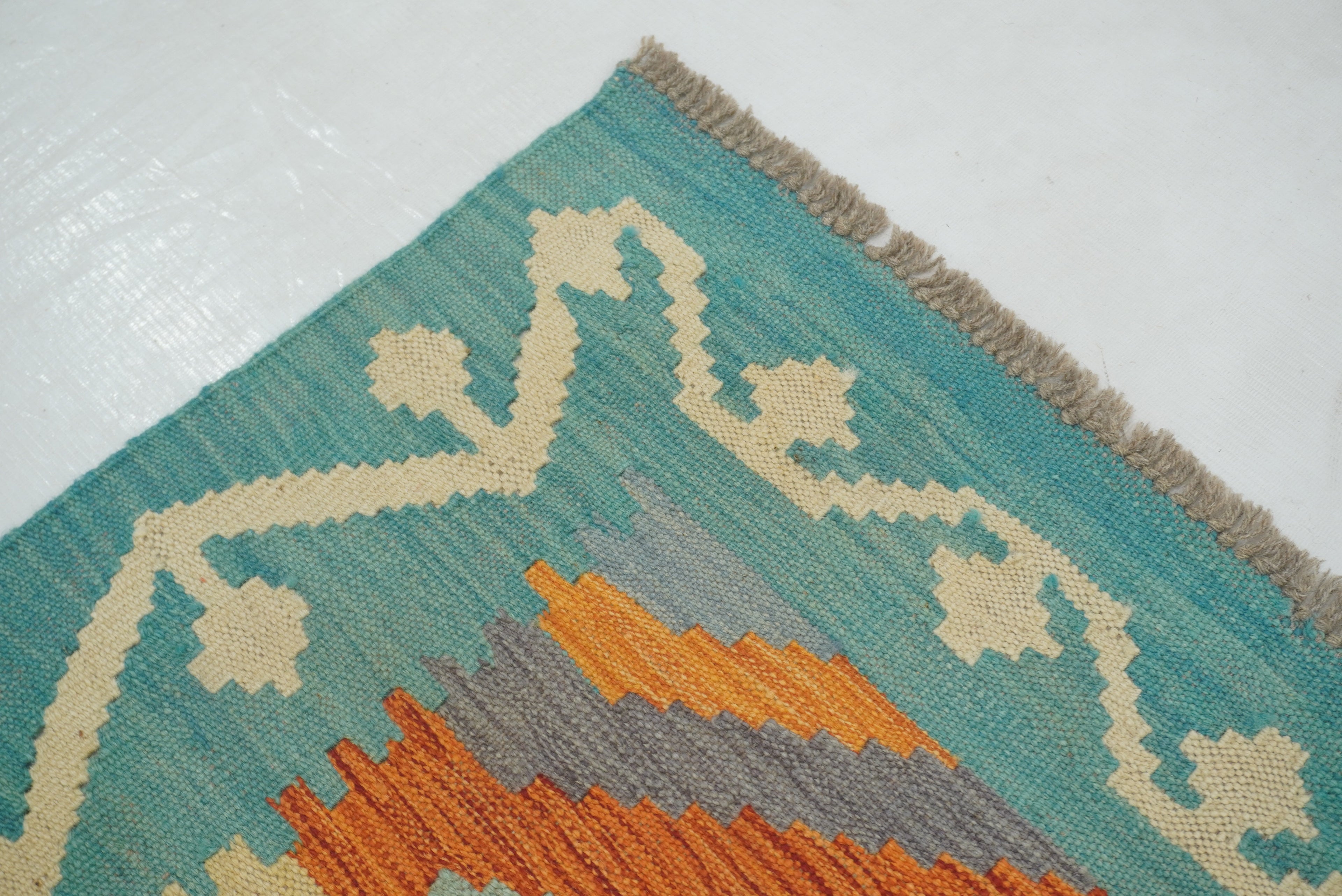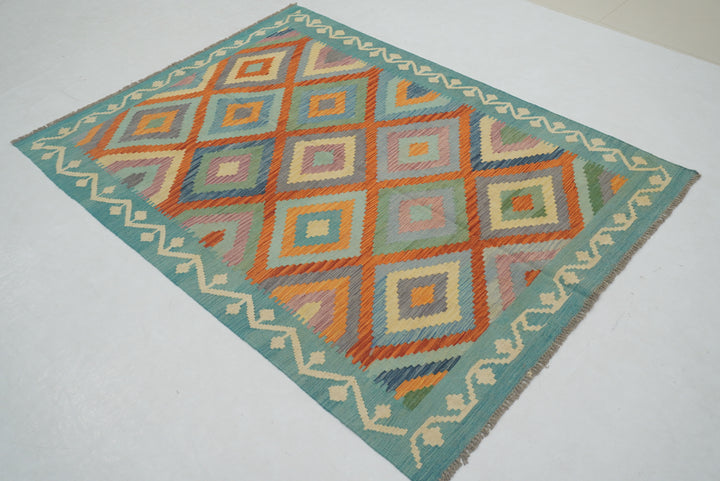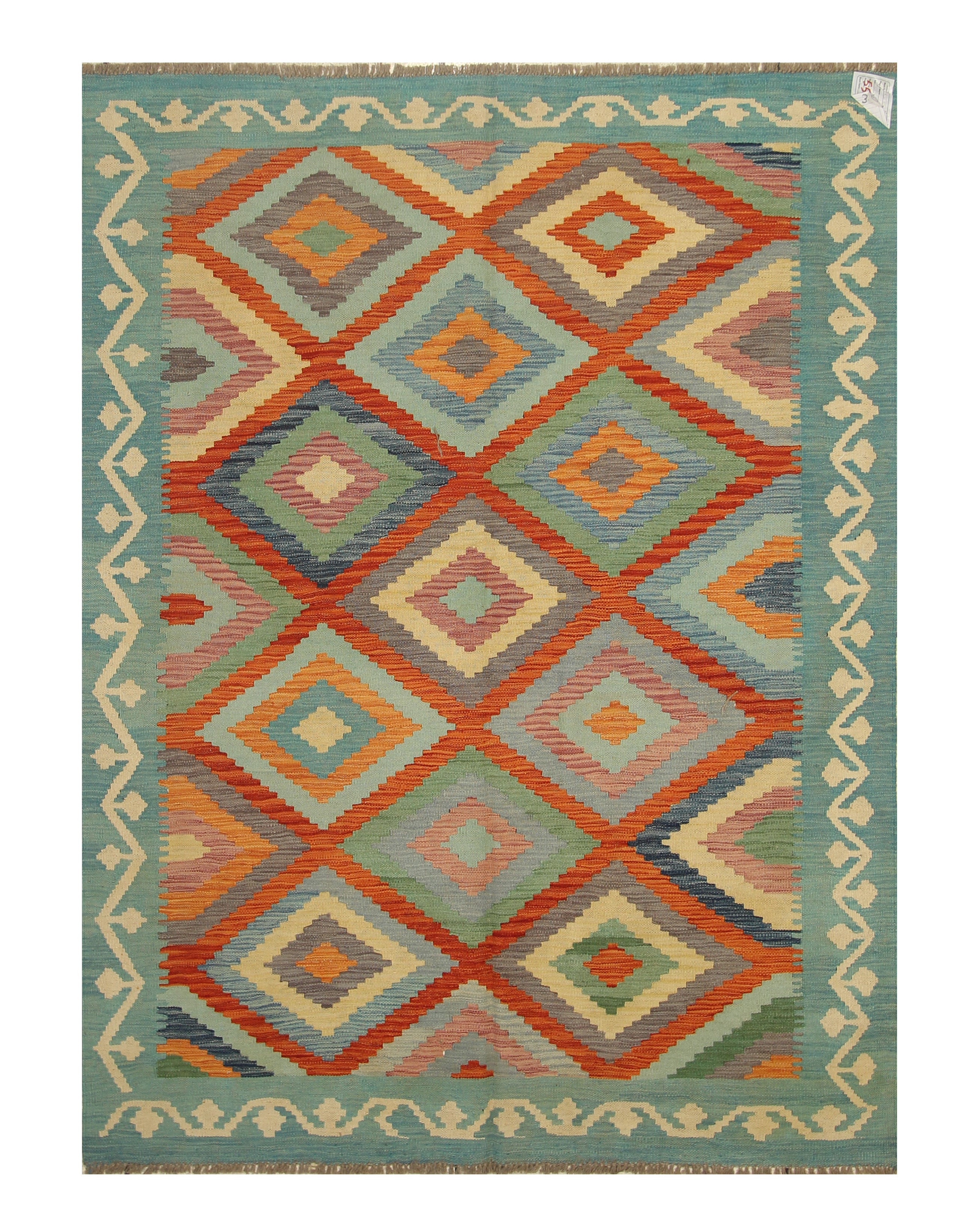5x7 Turquoise Blue Orange Afghan Handmade Reversible Kilim Rug