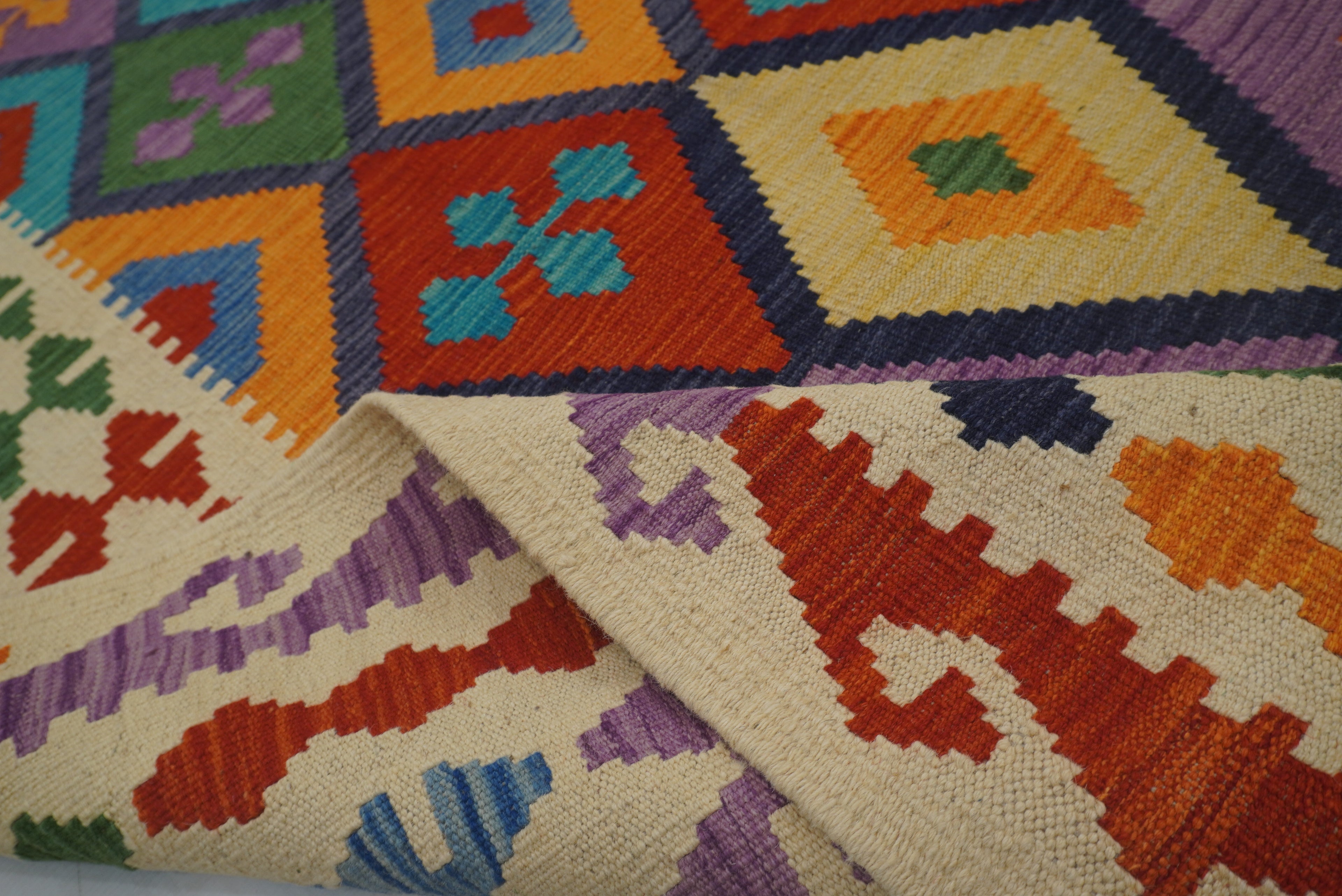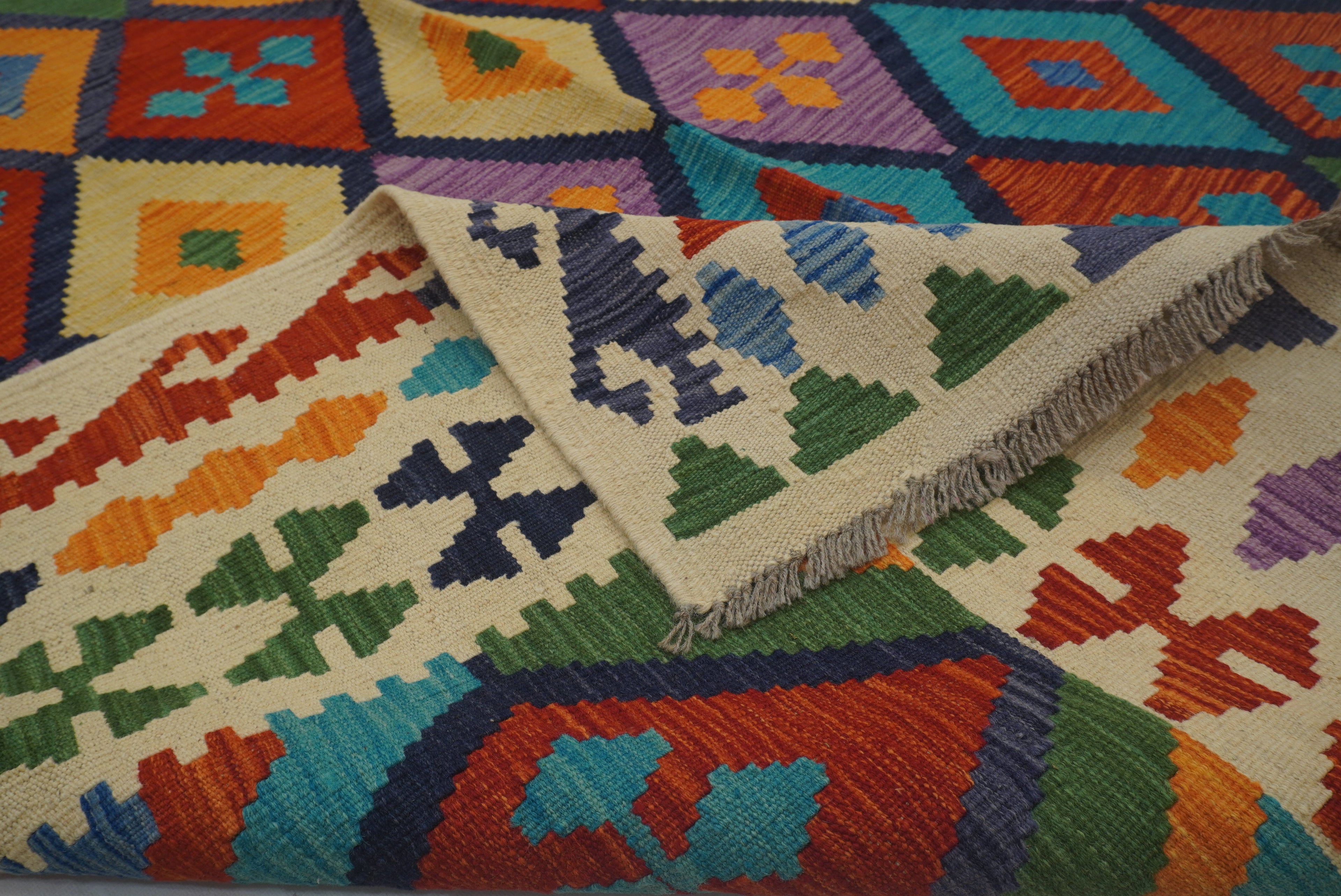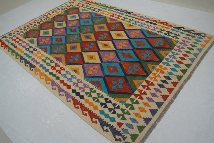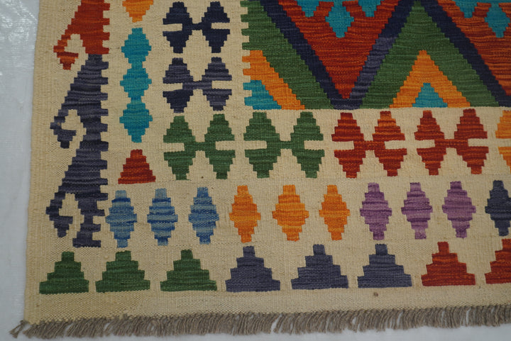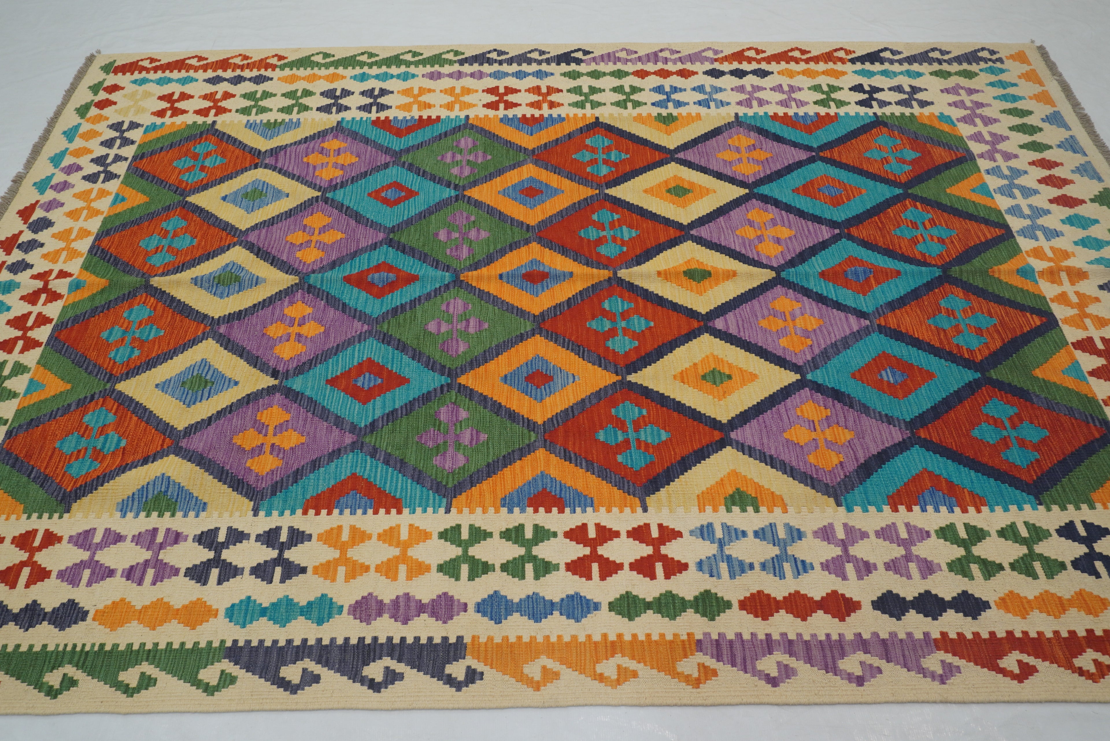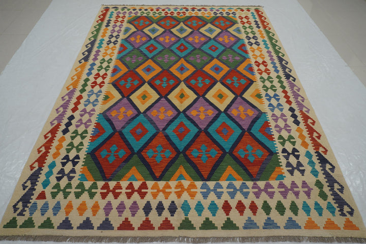 7x10 Beige Blue Kilim Afghan handmade Geometric Rug
