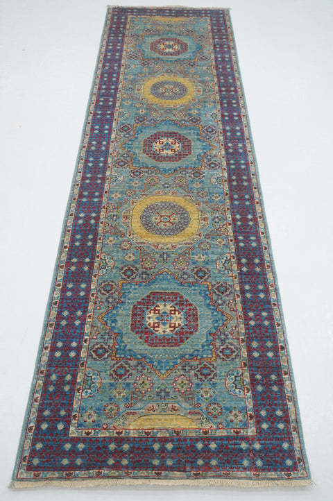 9 ft Pastel Blue Mamluk Afghan Hand knotted Medallion Runner Rug